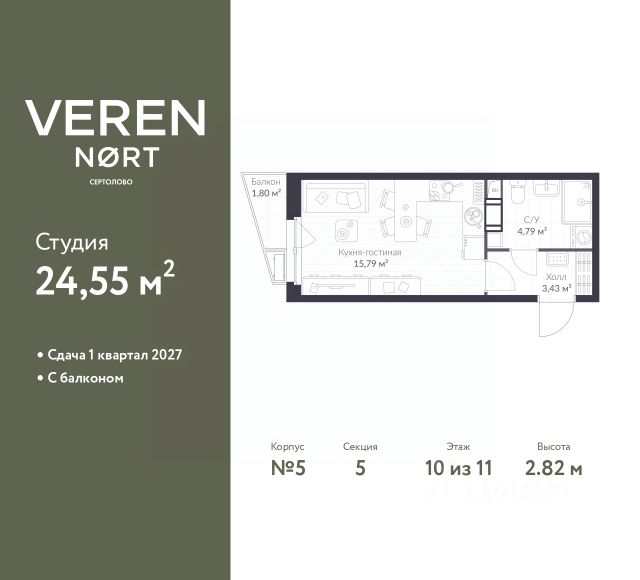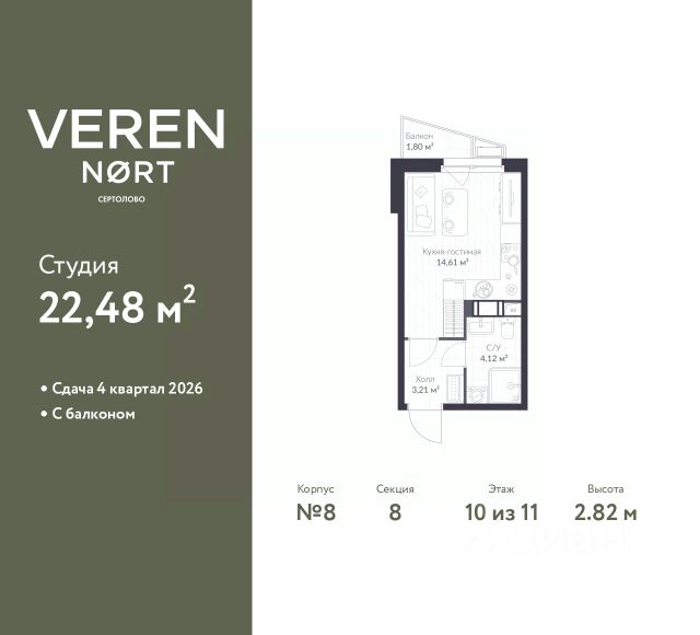 Спешите оформить бронирование по акционной цене, предложение ограничено! Стоимость квартиры указана со скидкой, ваша экономия составит 1,642,080 руб. Звоните, наши менеджеры вам все расскажут. Продается 1-комн. квартира-студия в Veren Nort Сертолово на 10 этаже. Квартира без отделки, новый собственник может сделать ремонт по индивидуальному проекту. Общая площадь: 25.97 кв.м., площадь гостиной 16.34 кв.м., из которых 3 кв.м. выделено под кухонную зону. Все окна выходят на одну сторону. В квартире один балкон, один совмещенный санузел. Высота потолков 2.82 м. Квартира находится в корпусе 2. Дом монолитный, одноподъездный, высотой 11 этажей. На этаже 14 квартир. В подъезде 1 пассажирский и 1 грузовой лифт. Начало строительства - 3 квартал 2023 года. Окончание строительства - 1 квартал 2026 года. Оформление сделки по договору долевого участия. С балконом, вид на приватный двор. Сочетание современной архитектуры и отличной экологии севера Лен. области. Выразительный облик домов разработан именитым архитектурным бюро "Остоженка". Характеристики жилого комплекса исключительны: продуманный ландшафтный дизайн, оригинальные парадные, разработанные по индивидуальному дизайн-проекту, современные детские и многофункциональные спортивные площадки, летний кинотеатр под открытым небом, два детских сада. Комплекс создается в уже сложившейся инфраструктуре г. Сертолово и обладает удобным транспортным сообщением с Санкт-Петербургом. В 300 метрах от "VEREN NORT сертолово" планируется транспортно-пересадочный узел "Сертолово", который обеспечит удобную железнодорожную связь с Финляндским вокзалом Санкт-Петербурга. #234C25