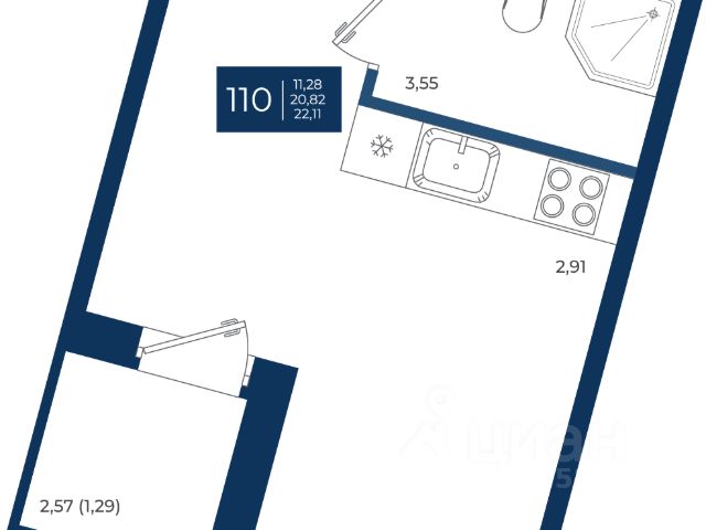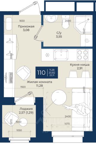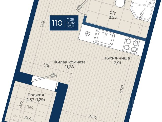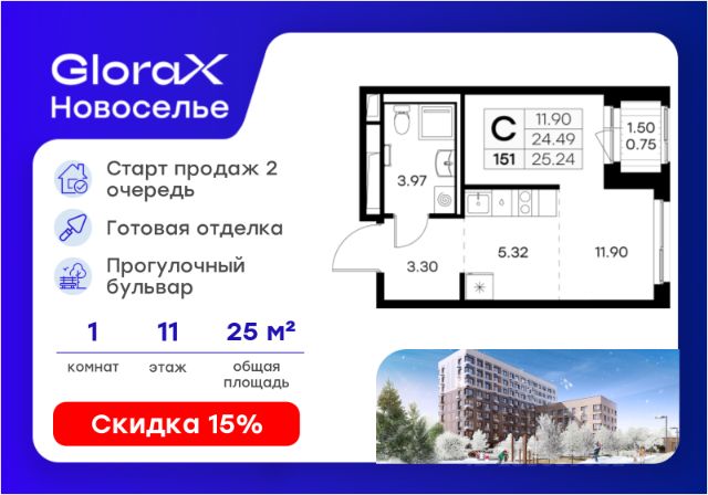 Продается квартира-студия на 11-м этаже в строящемся проекте комфорт-класса GloraX Новоселье. Общая площадь лота составляет 20,90 кв. м, из которых 10,24 кв. м отведено под жилую и 4,40 кв. м под кухонную зону. Номер квартиры - 148