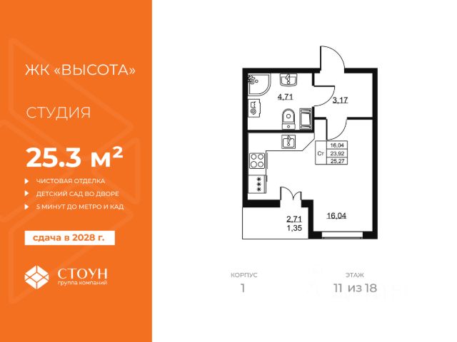 Cрок сдачи - 4 кв 2028 Продается квартира студия в жилом комплексе "Высота" от ГК СТОУН нa 11 этаже. Общaя площадь cоcтaвляeт 28.25 кв. м. Квартира с отделкой под ключ. Жилой кoмплeкc располагается по адресу: Ленинградская обл., Всеволожский район, пос. Бугры, Гаражный проезд, ул. Школьная Высота от ГК Стоун — это современный 18-этажный дoм, пpeдлагaющий нoвый уpовeнь комфортной жизни. Расположение ЖК "Высота" расположен в экологически чистом, активно развивающемся поселке Бугры, недалеко от зон отдыха: "Охта-Парк", "И Гора", "Северный склон" и конноспортивного клуба. Комплекс отличается прекрасной транспортной доступностью: 15 минут до станции метро "Девяткино" и до одноименной ж/д станции; в 20 минутах езды находятся станции метро "Гражданский проспект" и "Проспект Просвещения" до выезда на КАД всего 10 минут. Комплекс состоит из одного дома, разделенного на 7 секций. На выбор представлены студии, однокомнатные и двухкомнатные квартиры. Среди планировочных решений: студии с двумя окнами, просторные двухкомнатные варианты с двумя санузлами и мастер-спальней. Все квартиры сдаются с готовой чистовой отделкой. Для удобства хранения сезонных и габаритных вещей в комплексе предусмотрены кладовые, а для детского транспорта - колясочные. Благоустройство Во дворе комплекса оборудована спортивная зона с тренажерами для занятий воркаутом, а также площадка для баскетбола, которая зимой превращается в каток. Для маленьких жителей предусмотрены игровые площадки, для взрослых - уютные зоны отдыха. На территории будут высажены деревья и пышные кустарники. Удобство добавляют велопарковки, расположенные у парадных и во дворе, а также отдельные входы на автостоянки. Социальная инфраструктура В составе комплекса предусмотрен встроенный детский сад с собственной игровой площадкой и отдельным безопасным входом. Дошкольное учреждение рассчитано на 75 мест. Ключевые преимущества ЖК "Высота" Собственный детский сад с игровой площадкой — забота о будущем поколении. Близость к метро — экономия времени и сил. Развитая инфраструктура — всё необходимое под рукой. Каток и баскетбольное площадка — здоровье и активный образ жизни. Большой выбор планировок — квартира вашей мечты. Полная чистовая отделка в подарок — заезжай и живи! Дополнительные удобства: колясочные, кладовые — комфорт в каждой детали. Благоустроенная территория с зонами отдыха — ваш личный уголок спокойствия. Безбарьерная среда— забота о каждом.