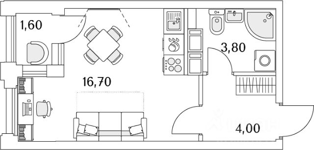 Квартира имеет квадратную форму комнаты с двумя окнами, что обеспечивает много света. Зонирована на кухонную и спальную зоны.