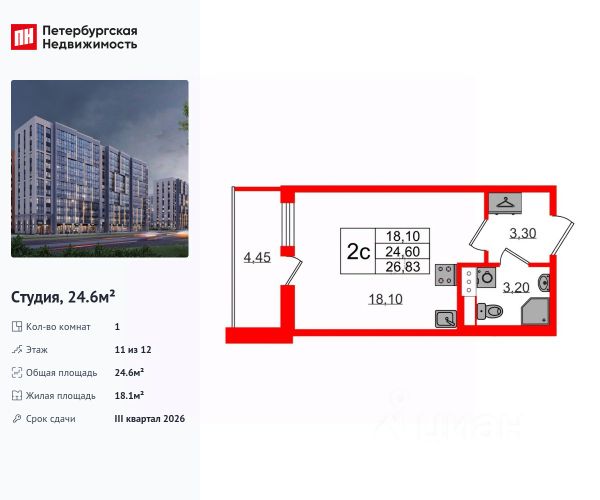 Продаётся студия в жилищном комплексе "Энфилд" (корпус Дом 18 секция 7). Общая площадь 28,12 кв. м, площадь комнат 18,56 кв.м. Санузел. Квартира расположена на 11 этаже 12 этажного дома. Срок сдачи корпуса IV квартал 2027 года. Современный жилой квартал "Энфилд" от компании Arsenal объединяет в себе преимущества хорошей экологии и удобного расположения рядом с городом. Квартал расположен на территории Мурино-Бугры, в 10 минутах от метро Девяткино. В состав ЖК "Энфилд" войдет 17 домов высотой до 12 этажей, 14 из них уже построено и сдано. На территории работает два детских сада и школа с углубленным изучением иностранных языков. Квартал славится красивой территорией, пешеходным бульваром с фонтанами, детскими и спортивными площадками, инфраструктурой для отдыха. В 5 минутах ходьбы расположен гипермаркет "Лента", из квартала предусмотрен удобный выезд на КАД.