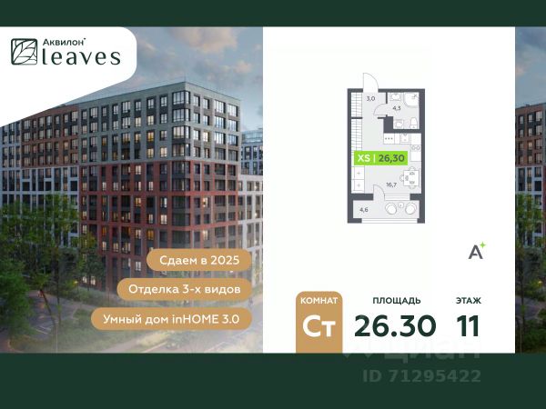 В продаже кoмфopтнaя пpocторная студия 26.5 кв. м c лоджиeй 5.7 кв.м. на 11 этаже в coвpeменном жилом комплeксе "Тpиумф Парк" от израильской компании "Milrend Development" . ЖК многократный призер и лауреат премий в области экологичности, энергоэфективности, городской недвижимости (более 10 наград).