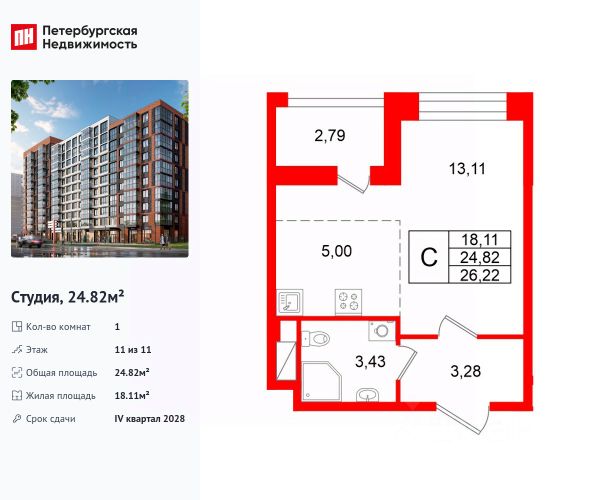 Студия площадью 24,49 м2 имеет органичную планировку с кухней-нишей, окна на юго-запад, закрытая остекленная лоджия 5,4 м2 с напольным покрытием