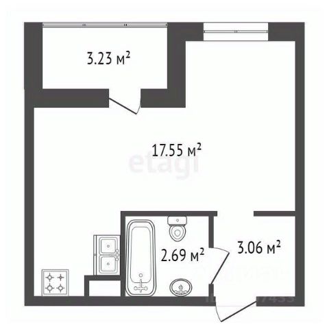 Площадь квартиры-23.3 м2,жилая: 17,55м2, прихожая 3,06 м2,санузел 2,69 м2, лоджии- 3,23 м2