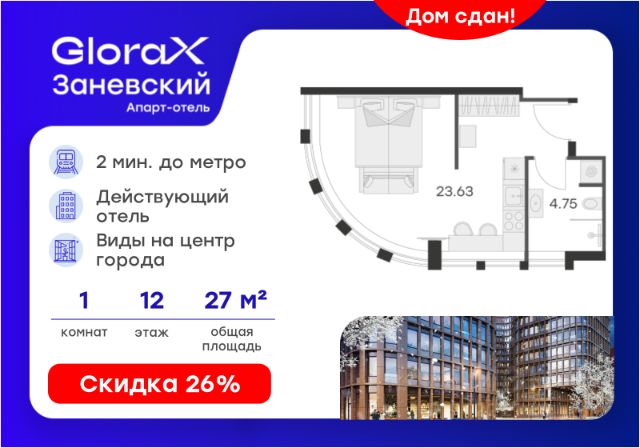 Продается апартамент-студия на 12-м этаже в сданном Апарт-комплексе бизнес-класса "GloraX Заневский". Ключи сразу! Общая площадь лота составляет 29,94 кв. м, из которых 25,01 кв. м отведено под жилую. Номер апартамента - 1 246. Преимущества: - Полная чистовая отделка - Возможность покупки меблировка и техника - Вход по ключ-карте - Прачечная на 1 этаже - Возможность дозаказа отельного сервиса - Программы доходности - Летний бар и променад - Воркаут площадка - Pet-friendly Апартаменты "GloraX Заневский" - проект бизнес-класса с развитой инфраструктурой, удовлетворяющей все потребности самых взыскательных гостей. Располагается в одном из наиболее перспективных, районов Петербурга в 2х минутах от метро "Ладожская" и в 10 минутах от Невского проспекта. В "GloraX Заневский" есть все, что необходимо для комфортной жизни, работы и отдыха. Инфраструктура, покрывающая все потребности и ожидания собственников и арендаторов. В радиусе 150 метров находятся супермаркеты с возможностью доставки продуктов прямо до дверей апартаментов. На 1000 кв. м. общественных пространств расположится уютный лобби-бар, ресторан мировой кухни на 80 человек и оборудованные коворкинги. В апартаментах "GloraX Заневский" выполнена современная отделка с использованием высококачественных экологичных материалов. В проекте предусмотрен подземный отапливаемый паркинг на 100 мест, куда можно спуститься на лифте прямо от дверей апартаментов. Узнайте подробности в Отделе продаж.