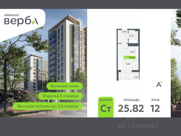 Продаётся квартира-студия площадью 22,7 кв.м на 12 этаже 15 этажного дома (Корпус 3, Секция 1) проекта ПИК Янинский лес. Светлый просторный подъезд на уровне земли, функциональная планировка, большие окна, c отделкой. Жилой квартал "Янинский лес" возводится в районе Янино-1 Ленинградской области. Автобусная остановка находится в 3 минутах пешком. Проект расположен вплотную к восточной границе Санкт-Петербурга - в 4 минутах от КАД. До метро "Ладожская" - 23 минуты на общественном транспорте. До исторического центра города можно доехать за 25 минут на автомобиле. "Янинский лес" - масштабный проект из 32 жилых корпусов, где будет всё для комфортной жизни. Здесь предусмотрены надземные паркинги, откроются детские сады, школа и поликлиника. Кроме этого, появятся места, в которых можно проводить свободное время: ледовая арена и торговый центр площадью больше 3000 м². Жилой район строится по всем правилам ПИК-Стандарта: в зелёных дворах-парках появятся современные детские и спортивные площадки, пешеходный бульвар и другие места для отдыха. На первых этажах разместятся магазины, кафе и другие сервисы. Во дворах не будет автомобилей, а для гостей предусмотрены парковочные места. Проект окружают лесные массивы. В пешей доступности находится Ржевский лесопарк: летом там можно гулять и собирать грибы, а зимой кататься на лыжах. Также рядом расположен памятник природы Колтушские высоты - парк с обустроенными экотропами и веломаршрутом. А главное место притяжения местных жителей - озеро с обустроенным местом для пикников. Артикул 1049599 (Застройщик ООО "СПЕЦИАЛИЗИРОВАННЫЙ ЗАСТРОЙЩИК"ЭКСТРАГРАД") [cn_sbp_1862914]