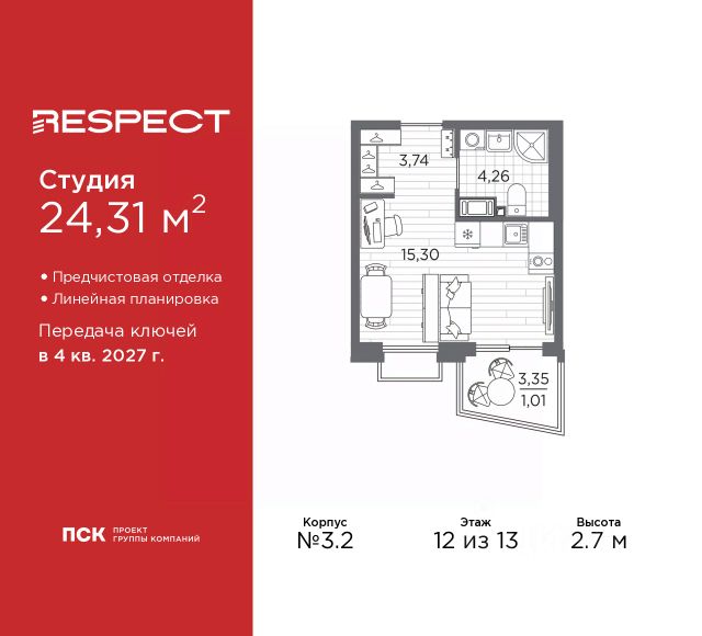 Просторная 1-комн. квартира-студия с отделкой в ЖК "RESPECT" на 12 этаже. Общая площадь: 31.08 кв.м., площадь гостиной 22.5 кв.м., из которых 5 кв.м. выделено под кухонную зону. Все окна выходят на одну сторону. В квартире одна лоджия, один совмещенный санузел. Высота потолков 2.7 м. Дом монолитный, многоподъездный, переменной этажности, от 8 до 13 этажей. Квартира находится в 1-й секции высотой 13 этажей в корпусе 3.3. На этаже 6 квартир. В подъезде 1 пассажирский и 1 грузовой лифт. Начало строительства - 3 квартал 2025 года. Окончание строительства - 4 квартал 2027 года. Оформление сделки по договору долевого участия. В шаговой доступности от жилого комплекса имеются станции метро (расстояние по прямой): "Лесная" (800 м), "Площадь Мужества" (1.4 км), "Выборгская" (1.9 км), также недалеко от этого корпуса находятся станции метро: "Академическая", "Политехническая". Жилой квартал "RESPECT" строится на Полюстровском пр, 87, в одной из самых востребованных локаций Петербурга. В 10 минутах пешком - метро "Лесная" и в 10 минутах на транспорте - Петроградская сторона. Высота домов от 7 до 13 этажей. Квартиры сдаются с отделкой white box и с чистовой отделкой. На территории Respect строится школа на 1125 учащихся и детский сад на 240 мест. Запроектированы собственная газовая котельная, закрытая территория, дворы без машин и подземные паркинги с лифтами. В проекте предусмотрены трапециевидные балконы или остекленные лоджии, которые, с одной стороны, исключают монотонность фасада, являясь декоративными элементами, с другой дополнительным функциональным пространством в квартирах. Цветовая гармония фасадов каждого дома раскрывает характер квартала. Коричневый цвет клинкерного кирпича со структурой водяных штрихов — цвет уюта и безопасности, сдержанности и надёжности. Вентилируемые фасады облицованы клинкерным кирпичом. Его высокая прочность позволяет давать 100 лет гарантии на этот материал. Водопоглощение клинкерного кирпича составляет менее 5%, за счет чего у него высокая теплопроводность и прочность. В квартале запроектированы внутренние закрытые территории дворов домов без доступа автомобилей и безбарьерная среда для велосипедистов и колясок. Предусмотрены IP-домофония с функцией дистанционного открывания калиток и парадных, а также дистанционный сбор показаний счетчиков и мобильное приложение для жителей. Для безопасности жителей квартала - круглосуточное видеонаблюдение и служба охраны. В каждой квартире предусмотрены внешние корзины для кондиционеров. Вся территория квартала будет связана единой концепцией благоустройства, разработанной ландшафтным бюро L.BURO. На эксплуатируемой кровле на уровне первого этажа в домах 1 и 4 будут обустроены общественные видовые террасы. Это станет не только привлекательным местом с красивым видом, но и удобным, многофункциональным пространством. Дизайн парадных зон и входных групп - сочетание лаконичности отделки и декоративных элементов с текстурами из натурального камня и дерева с приглушен