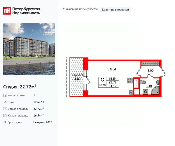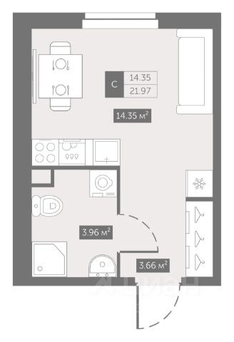 Общая площадь квартиры - 24,0 кв.м. + застекленная лоджия,