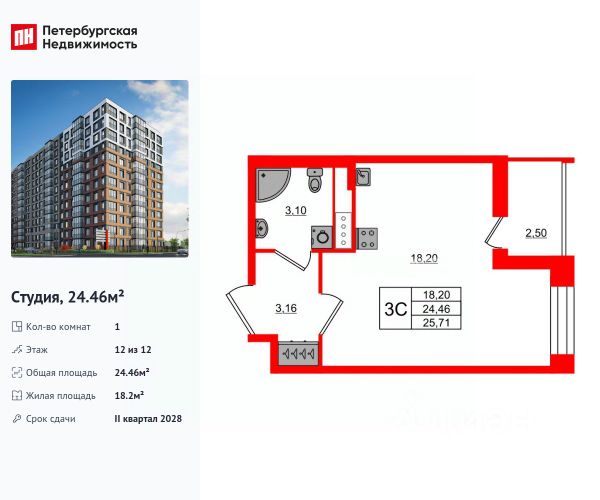 Продается уютная студия в новом доме на Уральской улице, Санкт-Петербург. Квартира расположена на 6 этаже 11-этажного дома, построенного в 2025 году. Общая площадь студии составляет 24,7 кв. м, из которых 18 кв. м — жилая, а 3 кв. м — кухня. Высота потолков — 2,75 метра, что добавляет ощущение простора.