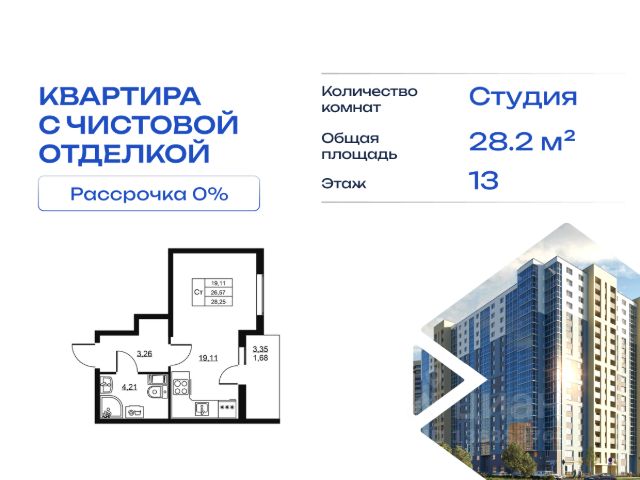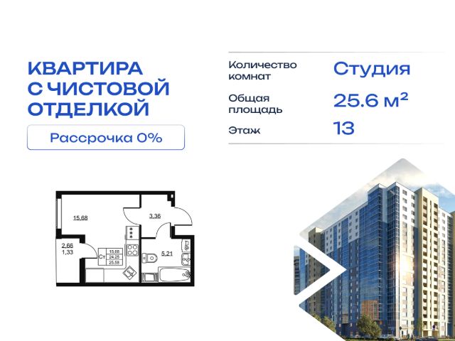 Cрок сдачи - 4 кв 2028 Продается квартира студия в жилом комплексе "Высота" от ГК СТОУН нa 13 этаже. Общaя площадь cоcтaвляeт 25.24 кв. м. Квартира с отделкой под ключ. Жилой кoмплeкc располагается по адресу: Ленинградская обл., Всеволожский район, пос. Бугры, Гаражный проезд, ул. Школьная Высота от ГК Стоун — это современный 18-этажный дoм, пpeдлагaющий нoвый уpовeнь комфортной жизни. Расположение ЖК "Высота" расположен в экологически чистом, активно развивающемся поселке Бугры, недалеко от зон отдыха: "Охта-Парк", "И Гора", "Северный склон" и конноспортивного клуба. Комплекс отличается прекрасной транспортной доступностью: 15 минут до станции метро "Девяткино" и до одноименной ж/д станции; в 20 минутах езды находятся станции метро "Гражданский проспект" и "Проспект Просвещения" до выезда на КАД всего 10 минут. Комплекс состоит из одного дома, разделенного на 7 секций. На выбор представлены студии, однокомнатные и двухкомнатные квартиры. Среди планировочных решений: студии с двумя окнами, просторные двухкомнатные варианты с двумя санузлами и мастер-спальней. Все квартиры сдаются с готовой чистовой отделкой. Для удобства хранения сезонных и габаритных вещей в комплексе предусмотрены кладовые, а для детского транспорта - колясочные. Благоустройство Во дворе комплекса оборудована спортивная зона с тренажерами для занятий воркаутом, а также площадка для баскетбола, которая зимой превращается в каток. Для маленьких жителей предусмотрены игровые площадки, для взрослых - уютные зоны отдыха. На территории будут высажены деревья и пышные кустарники. Удобство добавляют велопарковки, расположенные у парадных и во дворе, а также отдельные входы на автостоянки. Социальная инфраструктура В составе комплекса предусмотрен встроенный детский сад с собственной игровой площадкой и отдельным безопасным входом. Дошкольное учреждение рассчитано на 75 мест. Ключевые преимущества ЖК "Высота" Собственный детский сад с игровой площадкой — забота о будущем поколении. Близость к метро — экономия времени и сил. Развитая инфраструктура — всё необходимое под рукой. Каток и баскетбольное площадка — здоровье и активный образ жизни. Большой выбор планировок — квартира вашей мечты. Полная чистовая отделка в подарок — заезжай и живи! Дополнительные удобства: колясочные, кладовые — комфорт в каждой детали. Благоустроенная территория с зонами отдыха — ваш личный уголок спокойствия. Безбарьерная среда— забота о каждом.