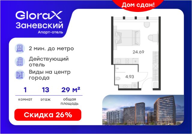 Продается апартамент-студия на 13-м этаже в сданном Апарт-комплексе бизнес-класса "GloraX Заневский". Ключи сразу! Общая площадь лота составляет 22,07 кв. м, из которых 18,92 кв. м отведено под жилую. Номер апартамента - 1 324. Преимущества: - Полная чистовая отделка - Возможность покупки меблировка и техника - Вход по ключ-карте - Прачечная на 1 этаже - Возможность дозаказа отельного сервиса - Программы доходности - Летний бар и променад - Воркаут площадка - Pet-friendly Апартаменты "GloraX Заневский" - проект бизнес-класса с развитой инфраструктурой, удовлетворяющей все потребности самых взыскательных гостей. Располагается в одном из наиболее перспективных, районов Петербурга в 2х минутах от метро "Ладожская" и в 10 минутах от Невского проспекта. В "GloraX Заневский" есть все, что необходимо для комфортной жизни, работы и отдыха. Инфраструктура, покрывающая все потребности и ожидания собственников и арендаторов. В радиусе 150 метров находятся супермаркеты с возможностью доставки продуктов прямо до дверей апартаментов. На 1000 кв. м. общественных пространств расположится уютный лобби-бар, ресторан мировой кухни на 80 человек и оборудованные коворкинги. В апартаментах "GloraX Заневский" выполнена современная отделка с использованием высококачественных экологичных материалов. В проекте предусмотрен подземный отапливаемый паркинг на 100 мест, куда можно спуститься на лифте прямо от дверей апартаментов. Узнайте подробности в Отделе продаж.