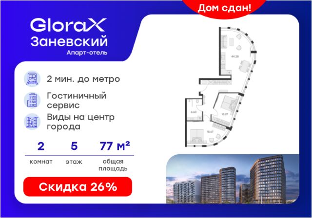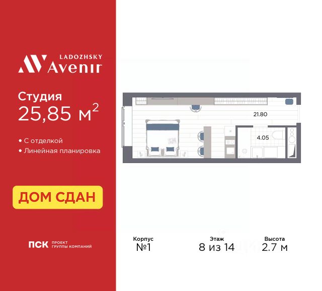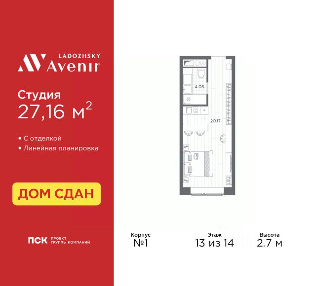 Просторные однокомнатные апартаменты-студия с отделкой в ЖК "Ladozhsky AVENIR" на 13 этаже. Общая площадь: 27.16 кв.м., площадь гостиной 23.11 кв.м., из которых 5 кв.м. выделено под кухонную зону. Все окна выходят на одну сторону. В апартаментах один совмещенный санузел. Высота потолков 2.7 м. Апартаменты находятся в корпусе 1. Дом монолитный, одноподъездный, высотой 14 этажей. На этаже 50 квартир. В подъезде 4 пассажирских и 4 грузовых лифта. В шаговой доступности от дома находятся станции метро (расстояние по прямой): "Ладожская" (800 м), "Новочеркасская" (1.7 км), также недалеко от этого корпуса расположены станции метро: "Площадь Александра Невского", "Чернышевская", "Площадь Восстания". Тест-драйв в готовых апартаментах. Перед покупкой можно арендовать номер для проживания с компенсацией от застройщика. Ladozhsky AVENIR — апартотель бизнескласса в историческом районе Матросская слобода на Правобережье Невы в 10 минутах пешком от станции метро "Ладожская" и 10 минутах на автомобиле до Невского проспекта. Апартотель Ladozhsky AVENIR — четвертый проект сети сервисных апартотелей AVENIR и первый мультиформатный проект, включающий в себя апартаменты, офисы и коммерческие помещения. Относится к высокому сегменту "Бизнес - класс" Все апартаменты сдаются с отделкой "под ключ" в единой стилистике. Семейная ипотека на апартаменты не распространяется. Деятельность по сдаче апартаментов в аренду осуществляет управляющая компания PSK INVEST, входящая в группу компаний "ПСК". Для передачи апартамента в управление PSK IINVEST необходимо заключить договор на приобретение пакета "Меблировка и оснащение". Аккредитация в банках: ПАО "Банк Уралсиб", "Сбербанк России", ПАО Банк "ВТБ", ПАО Банк "ФК Открытие", ПАО "Совкомбанк" и других. #1caZci