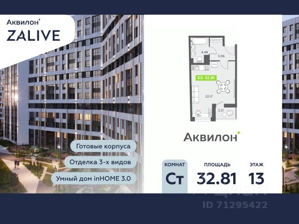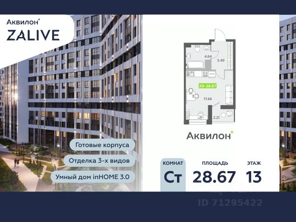 Купи квартиру в ЖК "Аквилон ZALIVE"! Отделка В квартире выполнена предчистовая отделка WhiteBox +Возможен дозаказ отделки в любом из 3 цветов: SAND, TERRA, GRAPHITE Отделка входит в стоимость квартиры в ДДУ ЖК "Аквилон ZALIVE" Жилой комплекс "Аквилон ZALIVE" расположился в уникальной части престижного Васильевского острова. С одной стороны рядом деловой и исторический центр, с другой берег Финского залива и новая современная инфраструктура в пешей доступности. Проект включает в себя пять тринадцатиэтажных "умных" домов в едином архитектурном стиле. Насыщенная социальная инфраструктура, инновации в каждой квартире, стильное благоустройство территории и видовые характеристики это лишь часть уникальных преимуществ жилого комплекса "Аквилон ZALIVE". -Малошумные лифты -Сквозные парадные -Светопрозрачные входные группы -Школа во дворе -Безбарьерная среда -Паркинг Стандарты Группы Аквилон для вашей комфортной жизни Thermo-S экономия на коммунальных платежах за счет дополнительно утепленных стен, кровли и цоколя. Энергоэффективные окна с селективным покрытием и аргоновым заполнением Soundstop - дополнительная шумоизоляция внутренних перегородок и межэтажных перекрытий, шумозащитные окна, малошумные лифты Light-in - в квартирах устанавливаются широкоформатные окна, увеличены на 30%. Высота подоконников на уровне 60 см от пола. Vent-in - в каждой комнате есть клапаны индивидуальной вентиляции, которые обеспечивают приток свежего воздуха с улицы. inHOME умный дом в каждой квартире Интеллектуальная цифровая система, которая позволит дистанционно решать бытовые вопросы, управлять квартирой и экономить на оплате коммунальных услуг. В состав inHOME входят: IP-домофон, Face key, "умные" счетчики, датчики протечки, дистанционное отключение розеток, и т.д. Двор ваш личный парк Для разработки проекта благоустройства и озеленения Группа Аквилон привлекла студию DEREVO PARK, которую ассоциация ландшафтных архитекторов России четыре года подряд признавала лучшей. Два хвойных сада, расположенные вдоль западной стороны квартала, станут визитной карточкой ЖК "Аквилон ZALIVE". Локация и инфраструктура Васильевский остров это море и прогулки, Санкт-Петербургский Государственный Университет и Ростральные колонны, музей современного искусства "Эрарта" и концептуальное пространство "Севкабель Порт". Достаточно переехать через мост и вот вы уже в центре или на Петроградской стороне. - 7 мин. до развязки ЗСД -12 мин. до м. Приморская -15 мин. до м. Невский проспект #z5CFFB