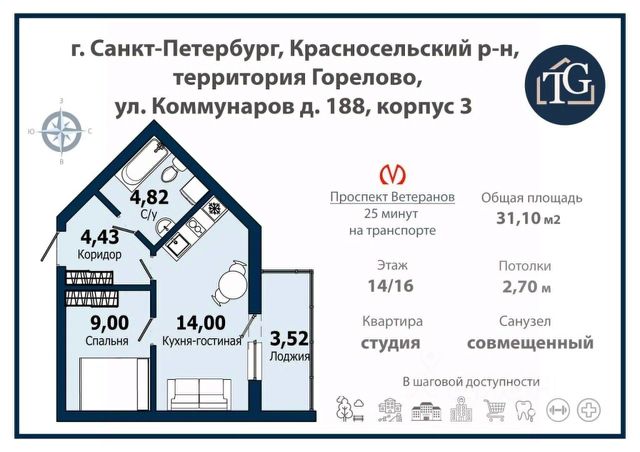 ЖИВИТЕ ВАШУ ЛУЧШУЮ ЖИЗНЬ В ПРОЕКТАХ ЭЛЕМЕНТ Студия 58 на 14 этаже в секции 1 Дома SHEPILEVSKIY (Шепилевский) Дом сдан! Выдаем ключи! О проекте: Торжественный и величавый, Клубный дом SHEPILEVSKIY (Шепилевский) включает 184 квартиры клубного формата. Дом гармонично вписан в существующий архитектурный контекст Алтайской улицы Московском районе. Из окон большей части лотов открывается захватывающий вид на юг, север и центр Петербурга. Максимальный обзор на город достигнут и за счет больших окон высотой от 2,5 до 5 метров. SHEPILEVSKIY (Шепилевский) предлагает новое видение жизни в премиальном объекте с особым акцентом на комфорт и технологичность жилой среды. В проекте Shepilevskiy более 100 передовых решений и девелоперских идей. Среди них единая акустическая система в общественных пространствах, система "умный дом", усиленная звуко- и теплоизоляция, бесконтактный доступ в дом Face Key, считыватели номеров авто в двухуровневом подземном паркинге и многое другое. 184 квартиры; 25 этажей; Лаундж-терраса под открытым небом на 24 этаже (72 метров!); 400 м2 общественных пространств; Парадное лобби; Кинозал; Комната для спорта; Коворкинг для деловых переговоров; Детский клуб; 2 800 м2 площадь авторского сквера; 4 минуты от м. Московская; ELEMENT создаёт инновационные жилые и коммерческие объекты в Санкт-Петербурге и Москве, которые устанавливают новые стандарты эффективной жизни в мегаполисах.