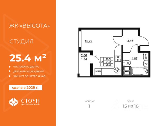 Cрок сдачи - 4 кв 2028 Продается квартира студия в жилом комплексе "Высота" от ГК СТОУН нa 15 этаже. Общaя площадь cоcтaвляeт 25.38 кв. м. Квартира отделка fine. Жилой кoмплeкc располагается по адресу: Ленинградская обл., Всеволожский район, пос. Бугры, Гаражный проезд, ул. Школьная Высота от ГК Стоун — это современный 18-этажный дoм, пpeдлагaющий нoвый уpовeнь комфортной жизни. Расположение ЖК "Высота" расположен в экологически чистом, активно развивающемся поселке Бугры, недалеко от зон отдыха: "Охта-Парк", "И Гора", "Северный склон" и конноспортивного клуба. Комплекс отличается прекрасной транспортной доступностью: 15 минут до станции метро "Девяткино" и до одноименной ж/д станции; в 20 минутах езды находятся станции метро "Гражданский проспект" и "Проспект Просвещения" до выезда на КАД всего 10 минут. Комплекс состоит из одного дома, разделенного на 7 секций. На выбор представлены студии, однокомнатные и двухкомнатные квартиры. Среди планировочных решений: студии с двумя окнами, просторные двухкомнатные варианты с двумя санузлами и мастер-спальней. Все квартиры сдаются с готовой чистовой отделкой. Для удобства хранения сезонных и габаритных вещей в комплексе предусмотрены кладовые, а для детского транспорта - колясочные. Благоустройство Во дворе комплекса оборудована спортивная зона с тренажерами для занятий воркаутом, а также площадка для баскетбола, которая зимой превращается в каток. Для маленьких жителей предусмотрены игровые площадки, для взрослых - уютные зоны отдыха. На территории будут высажены деревья и пышные кустарники. Удобство добавляют велопарковки, расположенные у парадных и во дворе, а также отдельные входы на автостоянки. Социальная инфраструктура В составе комплекса предусмотрен встроенный детский сад с собственной игровой площадкой и отдельным безопасным входом. Дошкольное учреждение рассчитано на 75 мест. Ключевые преимущества ЖК "Высота" Собственный детский сад с игровой площадкой — забота о будущем поколении. Близость к метро — экономия времени и сил. Развитая инфраструктура — всё необходимое под рукой. Каток и баскетбольное площадка — здоровье и активный образ жизни. Большой выбор планировок — квартира вашей мечты. Полная чистовая отделка в подарок — заезжай и живи! Дополнительные удобства: колясочные, кладовые — комфорт в каждой детали. Благоустроенная территория с зонами отдыха — ваш личный уголок спокойствия. Безбарьерная среда— забота о каждом.
