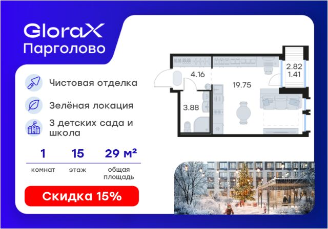 Продается квартира-студия на 15-м этаже в проекте комфорт-класса GloraX Парголово. Общая площадь лота составляет 28,71 кв. м, из которых 19,58 кв. м отведено под жилую и кв. м под кухонную зону. Номер квартиры - 270. Преимущества: - Квартира комфорт-класса - Зеленый район, Шуваловский парк в 20 мин. пешком - 10 мин. до КАД, 15 мин. до ЗСД - 5 эт. паркинг на 451 м/м - Закрытые дворы с видеонаблюдением - Детские площадки с геопласткой и бизиборадми - Сады и школы в шаговой доступности - Спортивные площадки и велодорожки - Собственный комьюнити-центр - Келлеры для хранения - Коммерческие помещения на 1 этажах GloraX Парголово — масштабный проект комфорт-класса в Выборгском районе Санкт-Петербурга. Место, продуманное до мелочей, где все, что необходимо — рядом. Архитектурно-пространственное решение отличается лаконичностью и строгостью и придает проекту свой характер. Внутренние дворы закрыты от внешнего мира, создавая приватную территорию для жителей. Живите на природе, но с комфортом мегаполиса. Десять минут на велосипеде или полчаса пешком — и вы окажетесь в одном из культовых мест отдыха петербуржцев: Шуваловском парке, Орловском заказнике с их чистыми карьерами или на Суздальских озерах. До ж/д станции "Парголово" 7 минут на автомобиле, до метро Проспект Просвещения 25 минут, КАД 10 минут, ЗСД 15 минут. В шаговой доступности остановка общественного транспорта. В шаговой доступности — собственные школы и детские сады. Здесь все создано для максимального комфорта каждого жителя. Приватное пространство внутреннего двора с беседками с розетками для работы и отдыха, зеленый двор с уютным многоуровневым освещением, детскими эко-площадками и спортивными workout создает неповторимую атмосферу, заряжающую энергией на новые свершения. Квартиры сдаются без отделки. Узнайте подробности в Отделе продаж.
