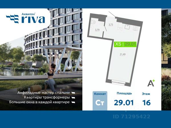 Однокомнатная квартира-студия от застройщика с отделкой в ЖК "Аквилон RIVA" на 16 этаже. Общая площадь: 22.08 кв.м., площадь гостиной 13.2 кв.м., из которых 5 кв.м. выделено под кухонную зону. Все окна выходят на одну сторону. В квартире один совмещенный санузел. Высота потолков 2.73 м. Дом монолитный, трехподъездный, переменной этажности, от 16 до 20 этажей. Квартира находится в 1-й секции высотой 20 этажей в корпусе 1. На этаже 15 квартир. В подъезде 2 пассажирских и 1 грузовой лифт. Окончание строительства - 4 квартал 2027 года. Оформление сделки по договору долевого участия. В шаговой доступности от дома находится станция метро (расстояние по прямой) "Девяткино" (1.9 км). ЖК "Аквилон RIVA" - жилой комплекс комфорт класса у метро Девяткино от Группы Аквилон В самом сердце двора раскинулся собственный водоём — не просто украшение, а часть вашей повседневной жизни. Летом — это благоустроенная набережная для прогулок, отдыха в тени деревьев и тихих вечеров у воды. А зимой водоём превращается в залитый каток — место, где звучит смех, скользят коньки и рождаются семейные традиции. Здесь каждое время года раскрывает свой характер. Зона уединения: Места для занятия йогой и медитаций Мульти скворечники Качели с подсветкой для уютных бесед Высокие скамейки на набережной для отдыха и чтения на свежем воздухе Активная зона: Развивающие детские площадки для разных возрастов Спортивные площадки с зоной Ворк-аут, Столы для настольного тенниса Площадка для пляжного волейбола Преимущества Увеличенные окна с заполнением аргоном Корзины под кондиционеры Сити-боксы вместо балконов Безбарьерная среда Бесшумные скоростные лифты Контроль доступа на территорию и видеонаблюдение Отделка квартир Чистовая отделка в трех цветовых решениях: Sand, Terra и Graphite Дозаказ для любой квартиры Стандарты Группы Аквилон для вашей комфортной жизни Thermo-S экономия на коммунальных платежах за счет дополнительно утепленных стен, кровли и цоколя. Энергоэффективные окна с селективным покрытием и аргоновым заполнением Soundstop - дополнительная шумоизоляция внутренних перегородок и межэтажных перекрытий, шумозащитные окна, малошумные лифты Light-in - в квартирах устанавливаются широкоформатные окна, увеличены на 30%. Высота подоконников на уровне 60 см от пола. Vent-in - в каждой комнате есть клапаны индивидуальной вентиляции, которые обеспечивают приток свежего воздуха с улицы. inHOME умный дом в каждой квартире Интеллектуальная цифровая система, которая позволит дистанционно решать бытовые вопросы, управлять квартирой и экономить на оплате коммунальных услуг. В состав inHOME входят: IP-домофон, Face key, "умные" счетчики, датчики протечки, дистанционное отключение розеток, и т.д. Паркинг Отдельно стоящий 3-х уровневый паркинг Электрозарядки на территории ЖК Локация м. Девяткино 5 минут Центр города - 20 минут КАД 5 минут. #zmUMDi