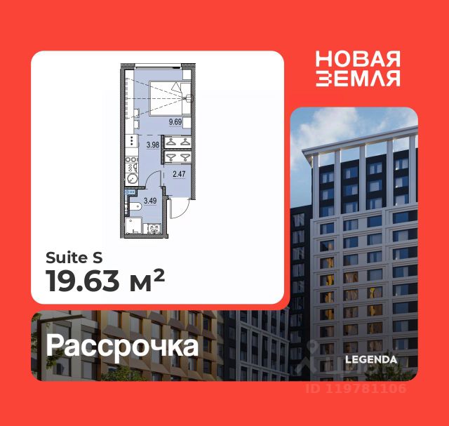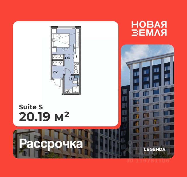 Продается 1-комн. квартира-студия с предчистовой отделкой в ЖК "Новая Земля" на 16 этаже. Общая площадь: 20.94 кв.м., площадь гостиной 15.75 кв.м., из которых 6.79 кв.м. выделено под кухонную зону. Все окна выходят на одну сторону. В квартире один совмещенный санузел. Высота потолков 2.85 м. Дом монолитный, многоподъездный, высотой 17 этажей. Квартира находится в 1-й секции в корпусе 1.6. На этаже 5 квартир. В подъезде 1 пассажирский и 1 грузовой лифт. Окончание строительства - 4 квартал 2028 года. Оформление сделки по договору долевого участия. Новая Земля — проект LEGENDA в локации морской набережной Васильевского острова, где уже сегодня формируется многообещающее и перспективное место для жизни и инвестиций. Проект состоит из двух очередей, расположенных в непосредственной близости, но имеющих идеологически разный подход к проектированию и ассортиментному предложению. Первая очередь, где квартиры уже в продаже, наполнена компактными функциональными и эстетичными сьютами в комплектации TechnoBox, подходящими для активной аудитории, предпочитающей больше времени проводить в городе. Транспортная доступность обеспечена благодаря близости выезда на ЗСД, который позволяет быстро добраться как до центра города, так и до других районов Санкт-Петербурга. Архитектурная концепция проекта задает новый стандарт для этой локации. Дизайн фасадов, большие окна без импостов, современные инженерные решения — всё это создаёт атмосферу комфортного и эстетичного пространства, отвечающего самым высоким требованиям. В проекте представлена новая линейка планировочных решений, созданных по принципам отельного проектирования. Сьюты от LEGENDA — это уникальная работа с пространством, сочетающая сверхфункциональность и удобство, чистоту линий и стилистический минимализм. Планировочные решения в рамках первой очереди проекта будут поделены на несколько сегментов, отличающихся размерами, функциональной наполненностью и отвечающих потребностям различных жителей проекта.
