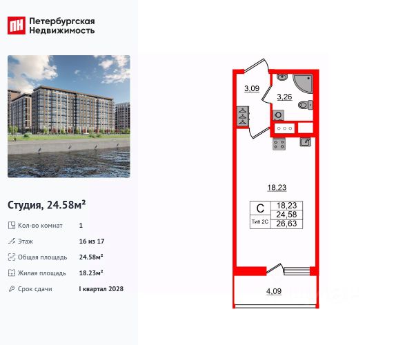 Продается просторная студия от застройщика в жилом комплексе "Setl Ривьера" в активно развивающимся Невском районе. До метро можно добраться на транспорте всего за 10 минут. Удобная, классическая, функциональная европланировка, вместительная прихожая 3.09 м². Общая площадь студии - 24.58 м², жилая 18.23 м², высота потолка 2.77 м. Квартира продается с отделкой "Норд Лайн серый плюс". Что особенного в ЖК "Setl Ривьера"? • Первая береговая линия Невы. 5 км до центра Петербурга • "Активити парк" - пространство для занятий спортом и отдыха. "Ривьера парк" с променадом и панорамной ротондой • Масштабные дворы 10 000 кв.м. с авторским ландшафтным дизайном • Двухуровневые единые входные группы • Видовые квартиры с террасами, каминами и саунами