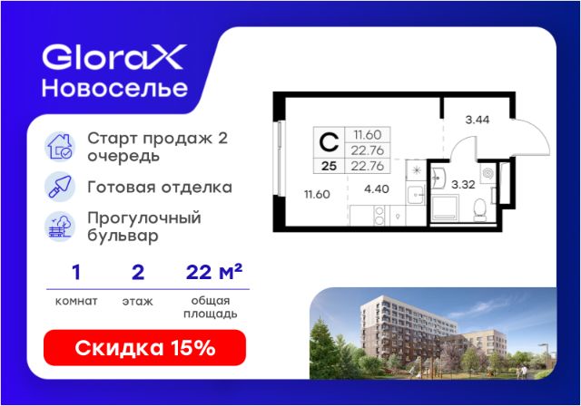 Продается квартира-студия на 2-м этаже в строящемся проекте комфорт-класса GloraX Новоселье. Общая площадь лота составляет 20,83 кв. м, из которых 10,36 кв. м отведено под жилую и 4,31 кв. м под кухонную зону. Номер квартиры - 248 Преимущества квартиры: - Квартиры комфорт-класса с чистовой отделкой в двух цветовых гаммах на выбор - Зеленый район, 5 мин. до Гореловсого лесопарки, 10 мин. до Шунгеровского заказника - 7 мин. до КАД, 16 мин. до ЗСД - 864 м/м на открытой стоянке - Благоустроенный собственный прогулочный бульвар - Закрытые дворы с видеонаблюдением - Детские площадки с геопласткой и бизиборадми - Сад и школа в шаговой доступности - Спортивные площадки и вело-дорожки - Коммерческие помещения на 1 этажах GloraX Новоселье — новый проект комфорт-класса на юго-западной границе Санкт-Петербурга и Ленинградской области. Близость к зеленым зонам Гореловского лесопарка и природного Шунгеровского заказника, а также пешеходный многофункциональный бульвар в центре квартала — идеальное место для тех, кто ценит природу и тишину, при этом не готов отказываться от благ современной инфраструктуры. Застройка осуществляется в рамках единой концепции, предусматривающей не только создание комфортного жилья, но и формирование собственной внутренней благоустроенной среды. Территория каждого двора разделена на зоны отдыха, досуга и игровые площадки с учетом возраста и потребностей детей и взрослых создает неповторимую атмосферу, заряжающую энергией на новые свершения. Это проект, в котором спокойно во всех отношениях. Живите на природе, но с комфортом мегаполиса. Проведите теплые дни в Гореловском лесопарке. Познакомьте детей с историей в Стрельне, Петергофе или Красном селе. Они разположены в 30 минутах от проекта. До ж/д станции "Сергиево" 11 минут на автомобиле, до метро Проспект Ветеранов 20 минут, КАД 7 минут, ЗСД 16 минут. В шаговой доступности остановка общественного транспорта. Рядом с проектом будут построены школа и детский сад. Здесь все создано для максимального комфорта каждого жителя. Приватное пространство внутреннего двора с беседками для работы и отдыха, зеленый двор с уютным многоуровневым освещением, детскими эко-площадками и спортивными workout создает неповторимую атмосферу, заряжающую энергией на новые свершения. Цена указана при 100% оплате или стандартной ипотеке. Узнайте подробности в Отделе продаж.