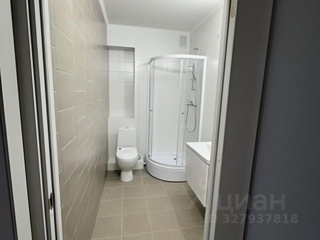 В ванной комнате: плитка, новая душевая кабинка, квадратная раковина.