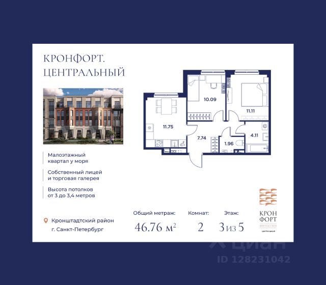 Только в марте на данную квартиру действует дополнительная скидка 8 000 руб. с кв.м. Стоимость квартиры в объявлении указана со скидкой 21%. Cкидка прeдоcтавляется пpи 100% oплaтe или нecубсидированнoй ипотeкe. Возможно повышение скидки до 24%. Подробности уточняйте в отделе продаж. Предлaгaeтся квартира плoщaдью 24.55 кв.м в жилом кoмплексе "Kронфoрт. Центpальный" в Санкт-Петeрбурге (Кронштадт). Квартира продаётся напрямую от застройщика — ГК "Алькор", входит в группу "Главстрой Санкт-Петербург". Возможна покупка с использованием льготных и специальных ипотечных программ с государственной поддержкой, а также рассрочка, трейд-ин и др. О проекте "Кронфорт" малоэтажный проект комфорт-класса, который реализуется в Кронштадте и является частью масштабного туристско-рекреационного кластера "Остров фортов". Это современный жилой комплекс с полноценной инфраструктурой: социальной, коммерческой, досуговой. Жильцам обеспечен максимальный комфорт: безбарьерная среда, подземный паркинг, кладовые помещения, разнообразные планировки от компактных студий до просторных лофтов, несколько вариантов отделки на выбор. Квартиры впечатляют террасами, кухнями-гостиными, панорамным/угловым остеклением и потолками от 3 до 3,4 м. Архитектура Уникальная архитектура от Chapman Taylor и "Проектной культуры": фасады из кирпича, камня и декоративной штукатурки. Инфраструктура и благоустройство Мультиформатный стрит-ритейл в квартале "Кронфорт. Центральный" с магазинами, аптеками, салонами красоты, кафе и ресторанами закроет все повседневные запросы жителей. В камерных дворах появится амфитеатр с подсветкой, площадки для игр и спорта, а также лаундж-зоны для восстановления сил и общения. Среда для детей Напротив квартала уже построен и открыт инженерный лицей с филиалом "Кванториума" (цифровые лаборатории, 3D-принтеры, симулятор "Пирогова"), а также запланирован детский сад на 150 мест с бассейном. Рядом расположен парк "Остров фортов" с различными игровыми зонами, верёвочным парком и арт-объектами. Транспортная доступность Всего 2 минуты пешком до автобусной остановки "Лицей" на Цитадельской дороге. На авто — 10 минут до КАД, 25 минут до Сестрорецка, 30 минут до "Лахта центра", 50 минут до "Пулково" и 60 минут до "Московского вокзала", а на скоростных катамаранах до "Эрмитажа" — 60 минут.