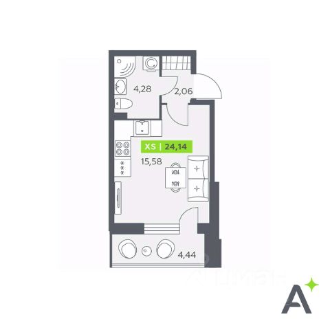 Просторная студия 22,2 м² + застеклённый балкон 3,14 м² — всего 25,24 м² полезного пространства.