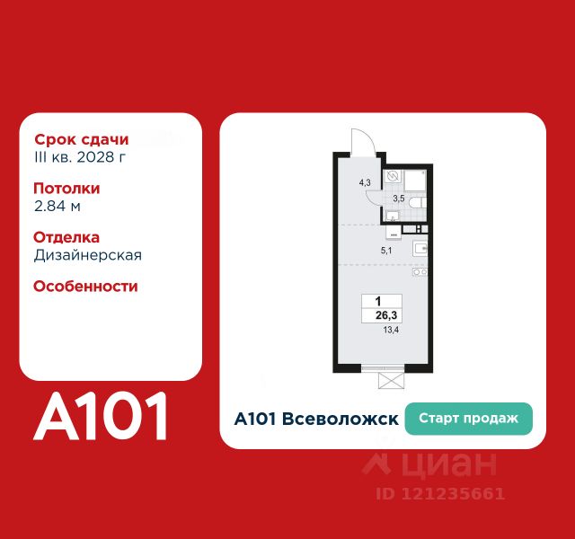 Старт продаж! Студия площадью 24.50 в ЖК "А101 Всеволожск" на 4 этаже. Квартира с отделкой. Вид из окна на улицу. В квартире 1 санузел. Высота потолков 2.84 м. Предложения от застройщика на январь 2026: - Гибкая рассрочка 20 000 руб/мес. и первым взносом 10%. ОТДЕЛКА Для квартир с чистовой отделкой предлагается три варианта дизайна: Классика, Карелия светлая и Карелия темная. Варианты всех дизайнерских решений представлены на фотографиях. Подробности можно уточнить у менеджера. На все отделочные работы от застройщика предоставляется гарантия. ОСОБЕННОСТИ ПЛАНИРОВКИ Планировка студии компактная и продуманная. Благодаря форме, близкой к квадрату, а не прямоугольнику, в квартире два полноценных окна, что обеспечивает большое количество естественного света. ПАРАДНАЯ. В каждой парадной предусмотрены места для хранения велосипедов и колясок, гостевой санузел и удобная зона ожидания для гостей. ДВОРЫ И ОКРУЖЕНИЕ. Просторные дворы свободны от машин и закрыты от посторонних. Предусмотрен подземный паркинг с возможностью спуститься из дома на -1 этаж и машиноместа с зарядными станциями для электромобилей. Большую часть комплекса займут благоустроенные зелёные зоны, теневые сады и городские общественные пространства с развитой тротуарной сетью и велодорожками. Каждый дом оборудован системами видеонаблюдения и контроля доступа. Не хватает средств на покупку кладового помещения? Оформите ипотеку на квартиру и добавьте к ней часть стоимости кладовой. ЗАСТРОЙЩИК ГК "А101" - крупный инвестиционно-строительный холдинг, занимает 6-е место по объему строительства в России (по данным "Единого ресурса застройщиков" на 2023 год). НКР присвоило ГК "А101" кредитный рейтинг A+.ru, подтверждая его надежность и финансовую устойчивость для завершения строительства ЖК.
