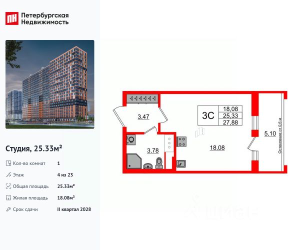 Продается просторная студия от застройщика в жилом комплексе "Город звезд" в новом городе на правом берегу Невы. До метро можно добраться на транспорте всего за 13 минут. Удобная, классическая, функциональная европланировка, просторная прихожая 3.47 м². Общая площадь студии - 25.33 м², жилая 18.08 м², высота потолка 2.77 м. Квартира продается с отделкой "NORD LINE SILVER". Что особенного в ЖК "Город звезд"? • Инновационный Лицей Setl с оригинальной архитектурной концепцией и уникальной образовательной средой • Невский лесопарк под окнами - всегда свежий воздух и полноценный отдых на природе • Четыре тематические площади отдыха с разнообразным благоустройством • Аллея Звёзд - променад протяженностью 5 км с ландшафтным озеленением, зонами отдыха и велодорожкой • Выход на набережную реки Утки, где можно порыбачить или взять напрокат лодку • Единая входная группа с ресепшен и подземный паркинг