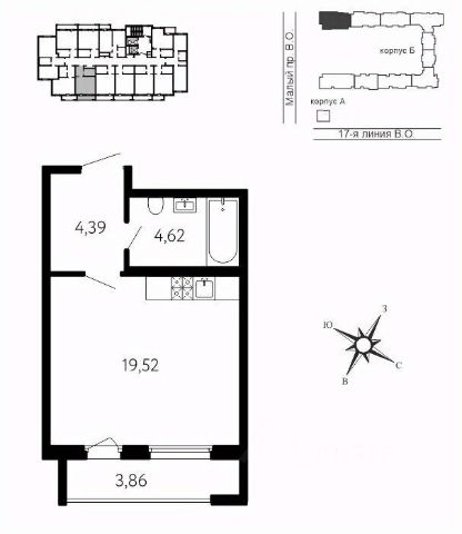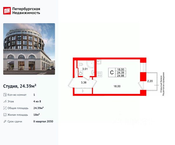 1-комн. квартира-студия в ЖК "Галерная гавань" на 4 этаже. Квартира без отделки, полностью готова к чистовой отделке и дальнейшему ремонту. Общая площадь: 29.45 кв.м., площадь гостиной 19.09 кв.м., из которых 5 кв.м. выделено под кухонную зону. Все окна выходят на одну сторону. В квартире один совмещенный санузел. Высота потолков 3.02 м.