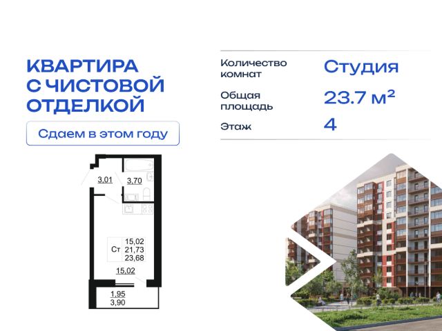 Строим кварталы для жизни с заботой о будущем. Предлагается квартира студия комфорт-класса 25,49 кв.м в корпусе 33 на 4 этаже, в ЖК "Новое Колпино"
