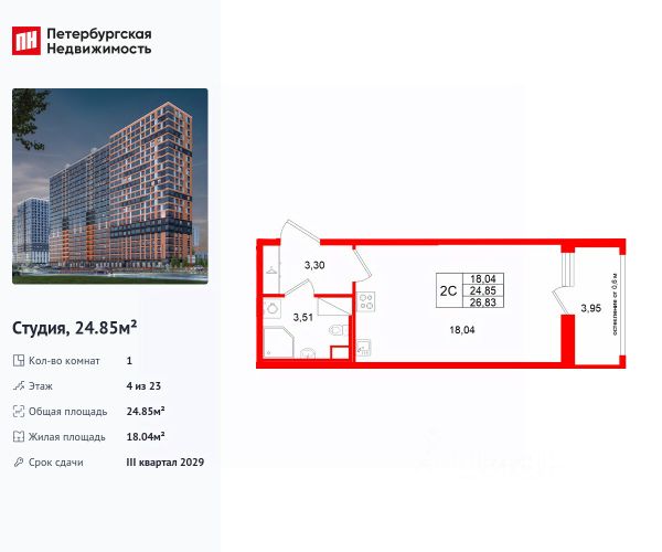 Большая квартира-студия общей площадью 40,5м²+балкон 5,69м²!