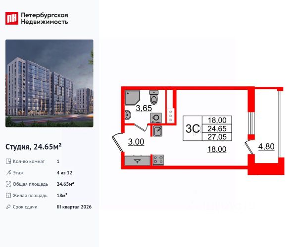1-комн. квартира-студия с предчистовой отделкой в ЖК "Сезоны" на 4 этаже. Общая площадь: 25.65 кв.м., площадь гостиной 17.52 кв.м., из которых 5 кв.м. выделено под кухонную зону. Все окна выходят на одну сторону. В квартире один балкон, один совмещенный санузел. Высота потолков 2.88 м. Дом монолитный, многоподъездный, высотой 7 этажей. Квартира находится в 1-й секции в корпусе 611. На этаже 4 квартиры. В подъезде 1 грузовой лифт. Начало строительства - 4 квартал 2025 года. Окончание строительства - 2 квартал 2028 года. Оформление сделки по договору долевого участия. Видовой жилой комплекс "Сезоны" от ГК ПСК возводится в одном из самых востребованных и престижных районов Санкт-Петербурга - Приморском, рядом с Суздальским и Выборгским шоссе. Такое расположение обеспечивает удобный выезд в разные части города, сочетая городской комфорт с близостью к природе. Всего в 50 метрах находится природный заказник "Новоорловский" и речка Каменка, а в пешей доступности - Суздальские озёра. Приморский район отличается развитой социальной и транспортной инфраструктурой. Здесь расположены крупные торговые и деловые центры, современные спортивные объекты, медицинские учреждения, магазины, кафе и рестораны. Комплекс включает четыре корпуса, ввод которых в эксплуатацию запланирован на 2028 год. Проект и прилегающий микрорайон разработаны в соответствии с концепцией "15-минутного города", при которой вся необходимая инфраструктура находится в шаговой доступности. В ближайшем окружении - две школы, пять детских садов, магазины, кафе, салоны красоты, банковские отделения и пункты выдачи заказов. Также предусмотрены два четырёхъярусных паркинга с лифтами на 288 машиномест. О застройщике ГК ПСК - один из крупнейших девелоперов Санкт-Петербурга с более чем 18-летней историей. Компания реализует проекты во всех сегментах недвижимости - от премиальных жилых комплексов до масштабных кварталов комфорт-класса и апарт-отелей. По данным портала ЕРЗ.РФ, ПСК входит в ТОП-3 крупнейших застройщиков Санкт-Петербурга по объёму текущего строительства. Портфель компании превышает 3 млн кв. м жилой и коммерческой недвижимости. Все объекты сдаются строго в срок и отличаются высоким уровнем архитектурных и инженерных решений. #27OOVa