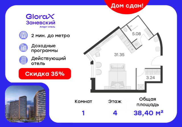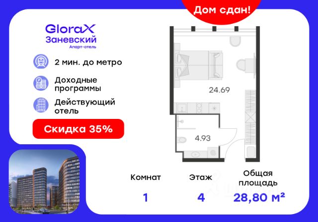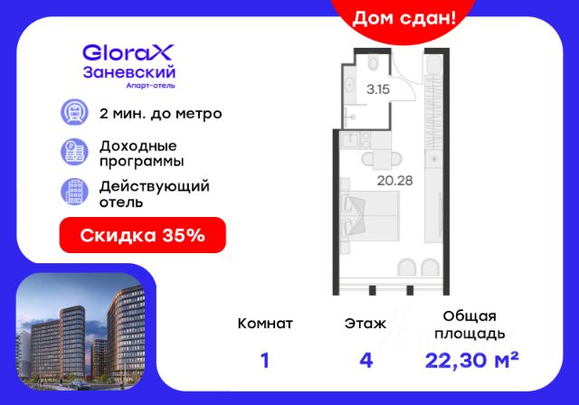 Продается апартамент-студия на 4-м этаже в сданном Апарт-комплексе бизнес-класса "GloraX Заневский". Ключи сразу! Общая площадь лота составляет 29,25 кв. м, из которых 24,32 кв. м отведено под жилую. Номер апартамента - 424. Преимущества: - Полная чистовая отделка - Возможность покупки меблировка и техника - Вход по ключ-карте - Прачечная на 1 этаже - Возможность дозаказа отельного сервиса - Программы доходности - Летний бар и променад - Воркаут площадка - Pet-friendly Апартаменты "GloraX Заневский" - проект бизнес-класса с развитой инфраструктурой, удовлетворяющей все потребности самых взыскательных гостей. Располагается в одном из наиболее перспективных, районов Петербурга в 2х минутах от метро "Ладожская" и в 10 минутах от Невского проспекта. В "GloraX Заневский" есть все, что необходимо для комфортной жизни, работы и отдыха. Инфраструктура, покрывающая все потребности и ожидания собственников и арендаторов. В радиусе 150 метров находятся супермаркеты с возможностью доставки продуктов прямо до дверей апартаментов. На 1000 кв. м. общественных пространств расположится уютный лобби-бар, ресторан мировой кухни на 80 человек и оборудованные коворкинги. В апартаментах "GloraX Заневский" выполнена современная отделка с использованием высококачественных экологичных материалов. В проекте предусмотрен подземный отапливаемый паркинг на 100 мест, куда можно спуститься на лифте прямо от дверей апартаментов. Узнайте подробности в Отделе продаж.