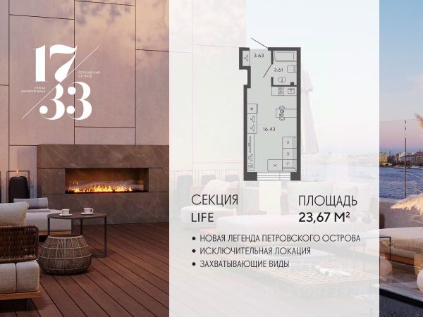 В прямой продаже апартаменты в премиальном жилом комплексе 17/33, расположенном на Петровском острове вдоль набережной Малой Невы. Захватывающие виды, вся ключевая инфраструктура для насыщенной жизни, отдыха, спорта. В постранстве Life будет фитнес, спа, коворкинг, библиотека, кинозал, жемчужиной общественных мест для жителей станет панорамный ресторан на крыше - "Небесная гостиная". Апартаменты сдаются с полной чистовой отделкой, срок сдачи 4 квартал 2026г.
