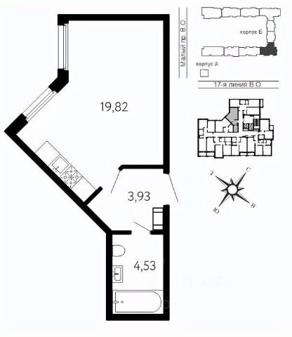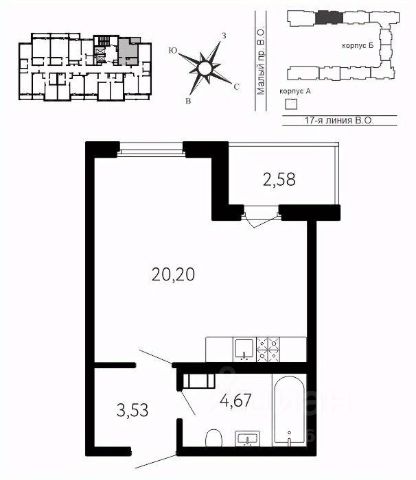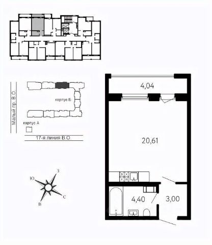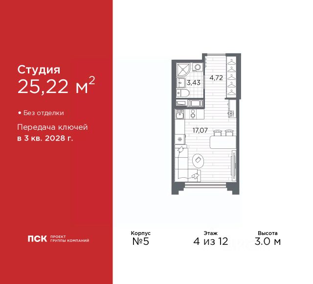 1-комн. квартира-студия в Клубный квартал "Ассамблея" на 4 этаже. Квартира без отделки, после получения ключей можно делать ремонт. Общая площадь: 25.22 кв.м., площадь гостиной 17.07 кв.м., из которых 5 кв.м. выделено под кухонную зону. Все окна выходят на одну сторону. В квартире один совмещенный санузел. Высота потолков 3.0 м. Дом монолитный, черырехподъездный, высотой 12 этажей. Квартира находится в 3-й секции в корпусе 5. На этаже 8 квартир. В подъезде 1 пассажирский и 1 грузовой лифт. Окончание строительства - 3 квартал 2028 года. Оформление сделки по договору долевого участия. В шаговой доступности от жилого комплекса расположены станции метро (расстояние по прямой): "Горный институт" (1.0 км), "Василеостровская" (1.4 км), "Приморская" (1.5 км), также недалеко от этого корпуса расположены станции метро: "Спортивная", "Чкаловская". "Клубный квартал Ассамблея" — проект бизнес-класса на Васильевском острове, в самом сердце исторического Петербурга. Комплекс состоит из пяти корпусов переменной этажности — от 7 до 12 этажей — с выразительной архитектурой в стиле неомодернизма: светлый клинкер, панорамное остекление, просторное лобби с потолками высотой почти 8 метров. Потолки — до 3,2 метров. Подземный паркинг на 667 машиномест. Комфорт и инфраструктура Проект ориентирован на комфортную городскую жизнь. В закрытом дворе — ландшафтное озеленение, современные детские и спортивные площадки. Внутренний клуб для резидентов включает коворкинг, переговорные, кинозал, фитнес и бьюти-зону. IP-домофония с просмотром камер видеонаблюдения, дистанционное открывание дверей и доступа на территорию и в парадную со смартфона и планшета, просмотр показаний счетчиков, приложение для жителей PSK Home. Локация Расположение на Васильевском острове — сильная сторона проекта. До четырех станций метро ("Горный институт", "Василеостровская", "Спортивная", "Приморская") — 515 минут пешком. В шаговой доступности — зелёные зоны, культурные учреждения, в том числе сад "Василеостровец" и ДК имени Кирова. Основные магистрали Большой, Средний и Малый проспекты, Наличная и Уральская улицы. Съезд на ЗСД расположен недалеко от станции метро "Приморская", близ береговой линии. Благовещенский и Дворцовый мосты соединяют остров с центром города, а мосты Тучков, Биржевой и Бетанкура — с Петроградской стороной. Застройщик Группа компаний ПСК является одной из ведущих девелоперских компаний Санкт Петербурга. На протяжении 18 лет она возводит в Северной столице качественное жилье премиум, бизнес и комфорт-класса, социальные объекты школы и детские сады, апарт-отели и торговые центры. Является шестикратным обладателем золотого знака "Надежный застройщик России". #ZMZ9E2