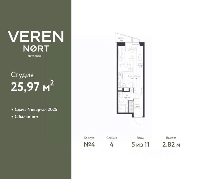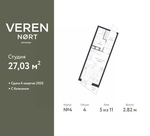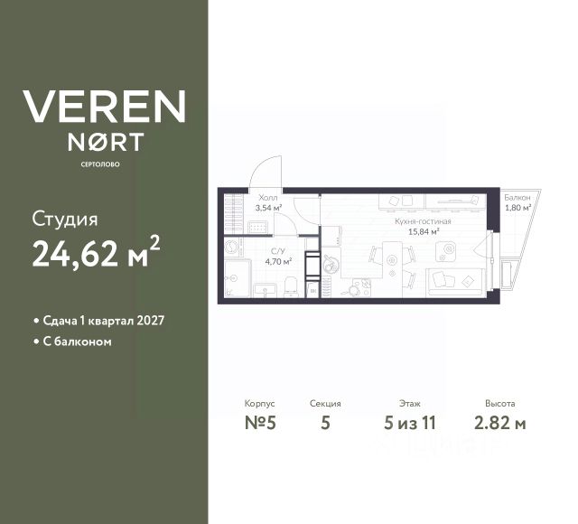 Торопитесь забронировать на этих условиях! Предложение ограничено! Стоимость квартиры указана со скидкой, ваша экономия составит 1,417,407 RUB. Информация по телефону, мы вам все подробно расскажем! 1-комн. квартира-студия от застройщика в Veren Nort Сертолово на 5 этаже. Квартира без отделки, полностью готова к ремонту. Общая площадь: 27.03 кв.м., площадь гостиной 16.49 кв.м., из которых 3 кв.м. выделено под кухонную зону. Все окна выходят на одну сторону. В квартире один балкон, один совмещенный санузел. Высота потолков 2.82 м. Квартира находится в корпусе 4. Дом монолитный, одноподъездный, высотой 11 этажей. На этаже 14 квартир. В подъезде 1 пассажирский и 1 грузовой лифт. Начало строительства - 3 квартал 2023 года. Окончание строительства - 4 квартал 2025 года. Оформление сделки по договору долевого участия. С балконом, вид на приватный двор. Сочетание современной архитектуры и отличной экологии севера Лен. области. Выразительный облик домов разработан именитым архитектурным бюро "Остоженка". Характеристики жилого комплекса исключительны: продуманный ландшафтный дизайн, оригинальные парадные, разработанные по индивидуальному дизайн-проекту, современные детские и многофункциональные спортивные площадки, летний кинотеатр под открытым небом, два детских сада. Комплекс создается в уже сложившейся инфраструктуре г. Сертолово и обладает удобным транспортным сообщением с Санкт-Петербургом. В 300 метрах от "VEREN NORT сертолово" планируется транспортно-пересадочный узел "Сертолово", который обеспечит удобную железнодорожную связь с Финляндским вокзалом Санкт-Петербурга. #Zuwdum