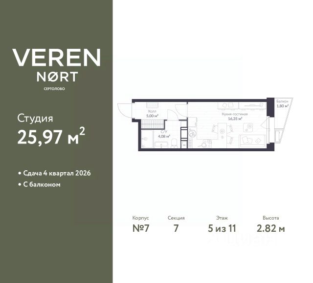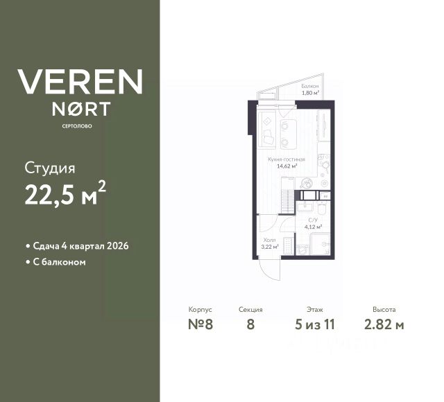 Спешите оформить бронирование, пока действует скидка, предложение ограничено! Стоимость квартиры указана со скидкой, ваша экономия составит 1,494,025 руб. Звоните, мы вам все подробно расскажем. 1-комн. квартира-студия в Veren Nort Сертолово на 5 этаже. Квартира без отделки, новый владелец может сделать ремонт по своему проекту. Общая площадь: 27.03 кв.м., площадь гостиной 16.49 кв.м., из которых 3 кв.м. выделено под кухонную зону. Все окна выходят на одну сторону. В квартире один балкон, один совмещенный санузел. Высота потолков 2.82 м. Квартира находится в корпусе 4. Дом монолитный, одноподъездный, высотой 11 этажей. На этаже 14 квартир. В подъезде 1 пассажирский и 1 грузовой лифт. Начало строительства - 3 квартал 2023 года. Окончание строительства - 1 квартал 2026 года. Оформление сделки по договору долевого участия. С балконом, вид на приватный двор. Сочетание современной архитектуры и отличной экологии севера Лен. области. Выразительный облик домов разработан именитым архитектурным бюро "Остоженка". Характеристики жилого комплекса исключительны: продуманный ландшафтный дизайн, оригинальные парадные, разработанные по индивидуальному дизайн-проекту, современные детские и многофункциональные спортивные площадки, летний кинотеатр под открытым небом, два детских сада. Комплекс создается в уже сложившейся инфраструктуре г. Сертолово и обладает удобным транспортным сообщением с Санкт-Петербургом. В 300 метрах от "VEREN NORT сертолово" планируется транспортно-пересадочный узел "Сертолово", который обеспечит удобную железнодорожную связь с Финляндским вокзалом Санкт-Петербурга. #ZU4Du6