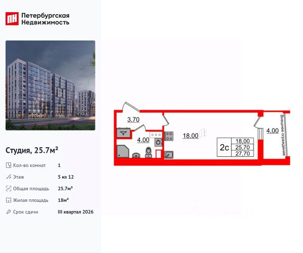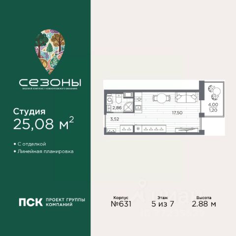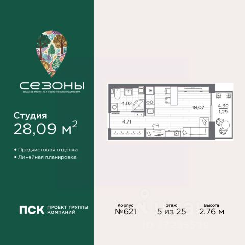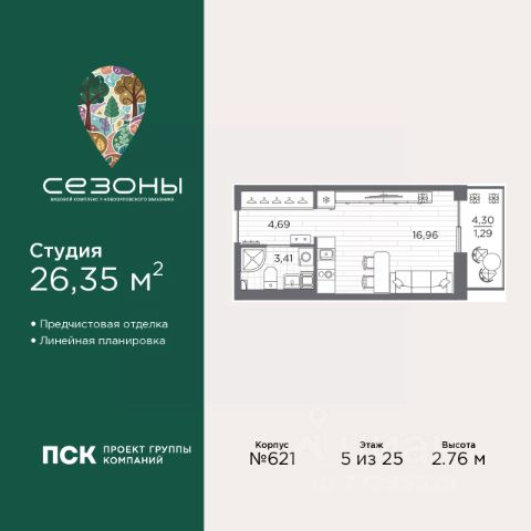 Просторная 1-комн. квартира-студия с предчистовой отделкой в ЖК "Сезоны" на 5 этаже. Общая площадь: 26.35 кв.м., площадь гостиной 16.96 кв.м., из которых 5 кв.м. выделено под кухонную зону. Все окна выходят на одну сторону. В квартире один балкон, один совмещенный санузел. Высота потолков 2.76 м. Квартира находится в корпусе 621. Дом монолитный, одноподъездный, высотой 25 этажей. На этаже 10 квартир. В подъезде 2 пассажирских и 1 грузовой лифт. Начало строительства - 4 квартал 2025 года. Окончание строительства - 2 квартал 2028 года. Оформление сделки по договору долевого участия. Видовой жилой комплекс "Сезоны" от ГК ПСК возводится в одном из самых востребованных и престижных районов Санкт-Петербурга - Приморском, рядом с Суздальским и Выборгским шоссе. Такое расположение обеспечивает удобный выезд в разные части города, сочетая городской комфорт с близостью к природе. Всего в 50 метрах находится природный заказник "Новоорловский" и речка Каменка, а в пешей доступности - Суздальские озёра. Приморский район отличается развитой социальной и транспортной инфраструктурой. Здесь расположены крупные торговые и деловые центры, современные спортивные объекты, медицинские учреждения, магазины, кафе и рестораны. Комплекс включает четыре корпуса, ввод которых в эксплуатацию запланирован на 2028 год. Проект и прилегающий микрорайон разработаны в соответствии с концепцией "15-минутного города", при которой вся необходимая инфраструктура находится в шаговой доступности. В ближайшем окружении - две школы, пять детских садов, магазины, кафе, салоны красоты, банковские отделения и пункты выдачи заказов. Также предусмотрены два четырёхъярусных паркинга с лифтами на 288 машиномест. О застройщике ГК ПСК - один из крупнейших девелоперов Санкт-Петербурга с более чем 18-летней историей. Компания реализует проекты во всех сегментах недвижимости - от премиальных жилых комплексов до масштабных кварталов комфорт-класса и апарт-отелей. По данным портала ЕРЗ.РФ, ПСК входит в ТОП-3 крупнейших застройщиков Санкт-Петербурга по объёму текущего строительства. Портфель компании превышает 3 млн кв. м жилой и коммерческой недвижимости. Все объекты сдаются строго в срок и отличаются высоким уровнем архитектурных и инженерных решений. #2to0Aa