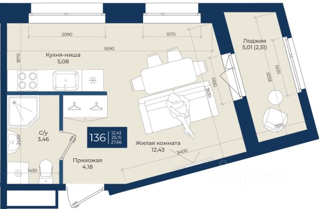 Просторная 1-комн. квартира-студия с предчистовой отделкой в ЖК "Брусника в Новоселье" на 6 этаже. Общая площадь: 31.95 кв.м., площадь гостиной 18.8 кв.м., из которых 5 кв.м. выделено под кухонную зону. Все окна выходят на одну сторону. В квартире один балкон, один совмещенный санузел. Высота потолков 2.7 м.