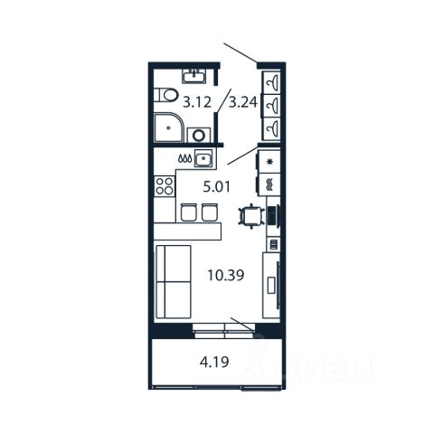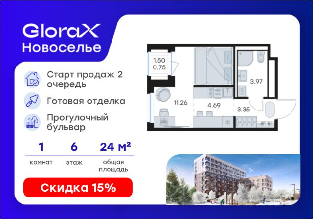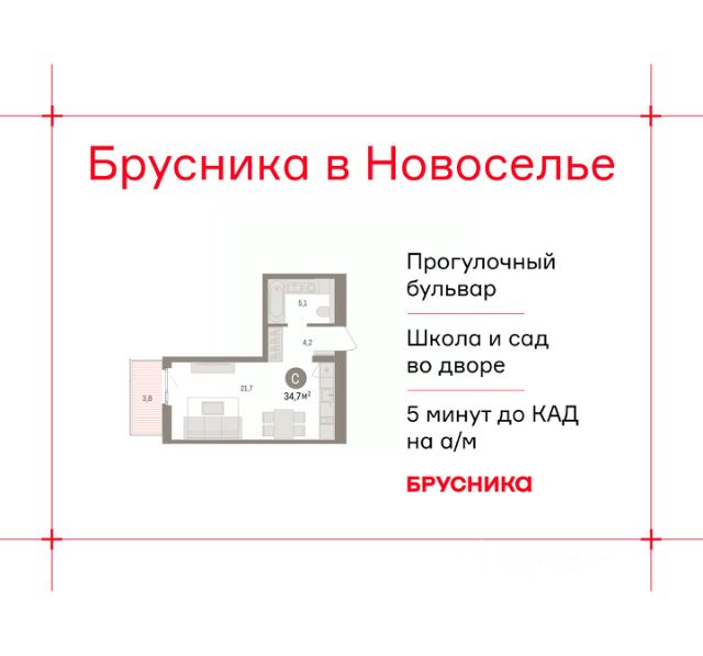 Продается однокомнатная квартира-студия с предчистовой отделкой в ЖК "Брусника в Новоселье" на 6 этаже. Общая площадь: 34.71 кв.м., площадь гостиной 21.7 кв.м., из которых 5 кв.м. выделено под кухонную зону. Все окна выходят на одну сторону. В квартире один балкон, один совмещенный санузел. Высота потолков 2.7 м.