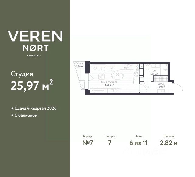 Напрямую продаётся уютная студия 129 общей площадью 27,95 м2 во II очереди в жилом комплексе Сертолово Парк от застройщика ГК Алгоритм. Все квартиры сдаются с чистовой отделкой в природных тонах. Пусть ваш дом будет теплым и уютным. Энергосберегающий дом строится по финским технологиям: наружные стены изготовлены из заводских трехслойных железобетонных панелей толщиной 390 мм, фасады утеплены - толщина утеплителя 150 мм - и закрыты декоративным слоем, толщина 90 мм. Увеличенные оконные проемы и потолки высотой 2,74 м придают квартирам в ЖК Сертолово Парк ощущение простора, обеспечивая максимальное естественное освещение и свежий воздух. Расположение ЖК: идеальное место для комфортной жизни в городе Сертолово. ЖК Сертолово Парк окружен прекрасным лесным массивом, что создает уникальную атмосферу спокойствия и природной красоты прямо за порогом вашего дома. Для детей и взрослых на территории ЖК имеются детские и спортивные площадки. Кроме того, чтобы обеспечить безопасность и уединенность, территория жилого комплекса полностью закрыта. А двор без машин обеспечит спокойствие для родителей и безопасность для детей..