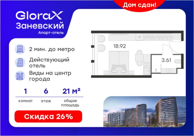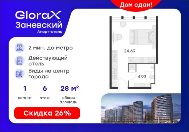 Продается апартамент-студия на 6-м этаже в сданном Апарт-комплексе бизнес-класса "GloraX Заневский". Ключи сразу! Общая площадь лота составляет 29,77 кв. м, из которых 24,84 кв. м отведено под жилую. Номер апартамента - 612. Преимущества: - Полная чистовая отделка - Возможность покупки меблировка и техника - Вход по ключ-карте - Прачечная на 1 этаже - Возможность дозаказа отельного сервиса - Программы доходности - Летний бар и променад - Воркаут площадка - Pet-friendly Апартаменты "GloraX Заневский" - проект бизнес-класса с развитой инфраструктурой, удовлетворяющей все потребности самых взыскательных гостей. Располагается в одном из наиболее перспективных, районов Петербурга в 2х минутах от метро "Ладожская" и в 10 минутах от Невского проспекта. В "GloraX Заневский" есть все, что необходимо для комфортной жизни, работы и отдыха. Инфраструктура, покрывающая все потребности и ожидания собственников и арендаторов. В радиусе 150 метров находятся супермаркеты с возможностью доставки продуктов прямо до дверей апартаментов. На 1000 кв. м. общественных пространств расположится уютный лобби-бар, ресторан мировой кухни на 80 человек и оборудованные коворкинги. В апартаментах "GloraX Заневский" выполнена современная отделка с использованием высококачественных экологичных материалов. В проекте предусмотрен подземный отапливаемый паркинг на 100 мест, куда можно спуститься на лифте прямо от дверей апартаментов. Цена указана при 100% оплате или стандартной ипотеке. Узнайте подробности в Отделе продаж.