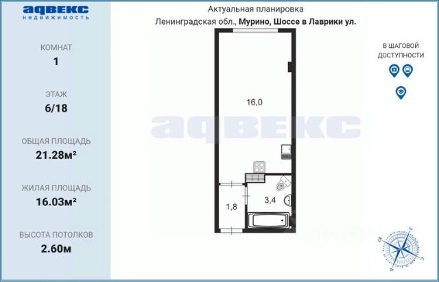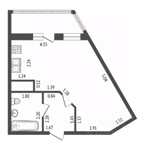 1-комн. квартира-студия от застройщика с отделкой в ЖК "Аквилон RIVA" на 6 этаже. Общая площадь: 28.29 кв.м., площадь гостиной 20.44 кв.м., из которых 5 кв.м. выделено под кухонную зону. Все окна выходят на одну сторону. В квартире один совмещенный санузел. Высота потолков 2.73 м.