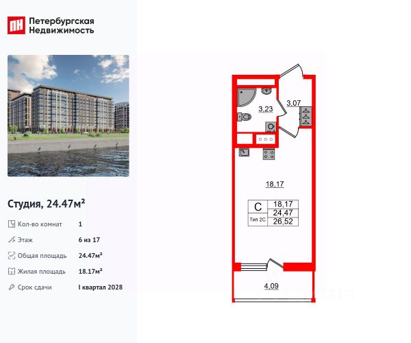 Цена действует при 100% оплате и на определенные ипотечные программы. Подробности — в отделе продаж по телефону. Продаётся студия в ЖК "Большая Охта" на 6 этаже. Общая площадь составляет 22.20 кв. м. Квартира с white box отделкой. Жилой комплекс "Большая Охта" располагается по адресу Санкт-Петербург, Красногвардейский. "ЛСР. Большая Охта" - проект бизнес-класса, в Красногвардейском районе между Якорной и Партизанской улицами, рядом с центром Петербурга. Престижный комплекс с удобной пешеходной и транспортной доступностью. Особенности квартиры высокие потолки и увеличенные окна. Горизонтальная разводка труб водоснабжения и отопления и вынесенные в холлы счетчики сохранят эстетичный дизайн комнат. Встроенные клапаны инфильтрации воздуха будут поддерживать чистоту и свежесть воздуха. Расположение: • 8 мин на авто до станции метро "Новочеркасская"; • 10 мин на авто до станции метро "Ладожская"; • 10 мин на авто до Таврического сада и исторического центра города; • 13 мин на авто до станции метро "Чернышевская"; • 25 мин на авто до КАД. Пространство внутри комплекса разделено на функциональные зоны: тематические, спортивные, уединенные. Все площадки окружают взрослые хвойные и лиственные деревья, подобранные с учетом роста, эстетики и сезонного цветения. Расширенная инфраструктура комплекса продумана до мелочей. Внутри квартала есть все необходимое для жизни с комфортом и удовольствием - детские сады и школы, магазины, площадки для спорта и отдыха, фитнес-залы, модные кофейни и общественные летние веранды. Преимущества: • Подземный паркинг и кладовые помещения; • Двор без машин; • Система "Умный дом" (в т.ч. управление домофоном со смартфона); • Пост охраны и консьерж; • Индивидуальный тепловой пункт; • Колясочные в каждой парадной; • Зарядка для электромобилей. Успейте приобрести квартиру на выгодных условиях! Чтобы узнать подробности, обращайтесь за консультацией по телефону.