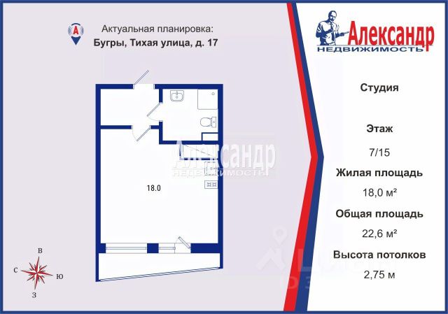Продаётся студия в сданном доме (Тихая, 13к1 (Дом 13 Корпус 1)), срок сдачи: III-кв. 2023, общей площадью 29 кв.м., на 7 этаже. ЖК "Стороны света" - современный жилой комплекс комфорт-класса в пос.Бугры Ленинградской области. Состоит из четырех корпусов, имеющих тематические названия - "Север" , "Юг" , "Запад" и "Восток". Общее количество квартир - 2294, в каждой из которых будет выполнена качественная отделка под ключ. Ст. метро "Девяткино", "пр.Просвещения" и "Парнас" в 15 минутах езды, 2 удобных выезда на КАД, развитая система наземного транспорта. Ж/Д станция "Девяткино", автовокзал "Северный" Инфраструктура В пределах района находятся крупные магазины МЕГА Парнас, гипермаркет О`КЕЙ, АШАН, IKEA, ТЦ "Гранд Каньон", фитнес-центры, развлекательные заведения и др. Благоустройство Обустроенная придомовая территория, детский городок с безопасным покрытием, спортивные площадки с тренажерами для взрослых, устройство дорожек, прогулочных зон, озеленение площадью 14 000 кв.м. Природа Рядом живописные озера "Кавголовское", "Хепоярви" и "Большое". Базы отдыха и курорты "Игора", "Северный склон", "Охта парк". Тематический парк "Изумрудное озеро". Парк семейного отдыха "Зубровник"