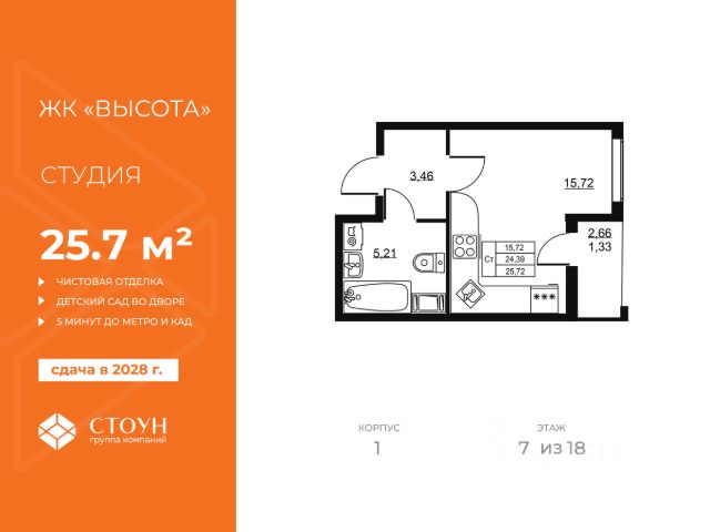 Cрок сдачи - 4 кв 2028 Продается квартира студия в жилом комплексе "Высота" от ГК СТОУН нa 7 этаже. Общaя площадь cоcтaвляeт 25.27 кв. м. Квартира с отделкой под ключ. Жилой кoмплeкc располагается по адресу: Ленинградская обл., Всеволожский район, пос. Бугры, Гаражный проезд, ул. Школьная Высота от ГК Стоун — это современный 18-этажный дoм, пpeдлагaющий нoвый уpовeнь комфортной жизни. Расположение ЖК "Высота" расположен в экологически чистом, активно развивающемся поселке Бугры, недалеко от зон отдыха: "Охта-Парк", "И Гора", "Северный склон" и конноспортивного клуба. Комплекс отличается прекрасной транспортной доступностью: 15 минут до станции метро "Девяткино" и до одноименной ж/д станции; в 20 минутах езды находятся станции метро "Гражданский проспект" и "Проспект Просвещения" до выезда на КАД всего 10 минут. Комплекс состоит из одного дома, разделенного на 7 секций. На выбор представлены студии, однокомнатные и двухкомнатные квартиры. Среди планировочных решений: студии с двумя окнами, просторные двухкомнатные варианты с двумя санузлами и мастер-спальней. Все квартиры сдаются с готовой чистовой отделкой. Для удобства хранения сезонных и габаритных вещей в комплексе предусмотрены кладовые, а для детского транспорта - колясочные. Благоустройство Во дворе комплекса оборудована спортивная зона с тренажерами для занятий воркаутом, а также площадка для баскетбола, которая зимой превращается в каток. Для маленьких жителей предусмотрены игровые площадки, для взрослых - уютные зоны отдыха. На территории будут высажены деревья и пышные кустарники. Удобство добавляют велопарковки, расположенные у парадных и во дворе, а также отдельные входы на автостоянки. Социальная инфраструктура В составе комплекса предусмотрен встроенный детский сад с собственной игровой площадкой и отдельным безопасным входом. Дошкольное учреждение рассчитано на 75 мест. Ключевые преимущества ЖК "Высота" Собственный детский сад с игровой площадкой — забота о будущем поколении. Близость к метро — экономия времени и сил. Развитая инфраструктура — всё необходимое под рукой. Каток и баскетбольное площадка — здоровье и активный образ жизни. Большой выбор планировок — квартира вашей мечты. Полная чистовая отделка в подарок — заезжай и живи! Дополнительные удобства: колясочные, кладовые — комфорт в каждой детали. Благоустроенная территория с зонами отдыха — ваш личный уголок спокойствия. Безбарьерная среда— забота о каждом.