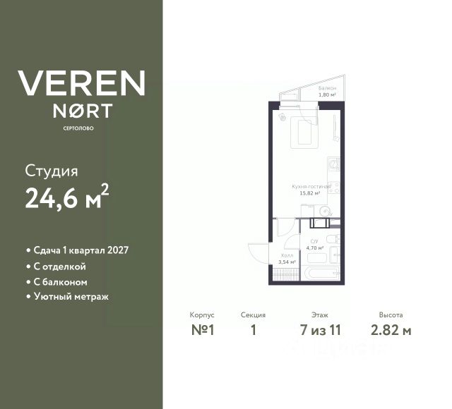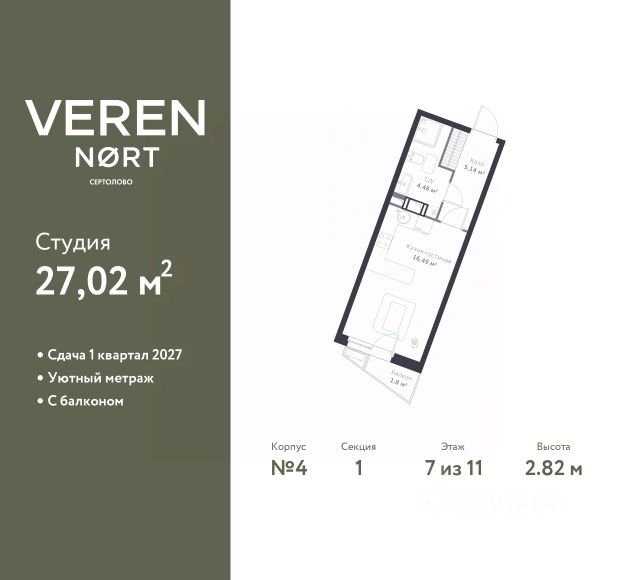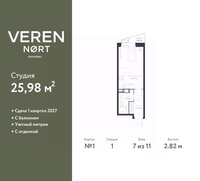 Компактная квартира, где каждый уголок зонирован и использован максимально полезно. Система хранения располагается в прихожей, а кухня и спальное место объединены в одно помещение. Балкон (5м2) станет отличным местом для отдыха на свежем воздухе. Напрямую продаётся квартира -студия 199 на 7 этаже (из 8) общей площадью 28,85 м2 в III очереди в жилом комплексе Сертолово Парк от застройщика ГК Алгоритм. Все квартиры в ЖК Сертолово Парк сдаются с чистовой отделкой в скандинавском стиле. Въезжайте и живите без дополнительных затрат на ремонт. Увеличенные оконные проемы и потолки высотой 2,74 м придают квартирам в ЖК Сертолово Парк ощущение простора, обеспечивая максимальное естественное освещение и свежий воздух. Энергосберегающий дом строится по финским технологиям: наружные стены изготовлены из заводских трехслойных железобетонных панелей толщиной 390 мм, фасады утеплены - толщина утеплителя 150 мм - и закрыты декоративным слоем -толщина 90 мм. Расположение ЖК: идеальное место для комфортной жизни в городе Сертолово. В 200 метрах находится детская и взрослая поликлиники. Вблизи детские сады и школы. ЖК Сертолово Парк окружен прекрасным лесным массивом, что создает уникальную атмосферу спокойствия и природной красоты прямо за порогом вашего дома. Для детей и взрослых на территории ЖК имеются детские и спортивные площадки. Кроме того, чтобы обеспечить безопасность и уединенность, территория жилого комплекса полностью закрыта. Крытый многоуровневый наземный паркинг с грузовым лифтом. Закрытая территория жилого комплекса с круглосуточным видеонаблюдением. Звоните! Ответим на все вопросы.