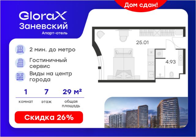 Продается апартамент-студия на 7-м этаже в Апарт-отеле "GloraX Заневский" с сервисом 4*. Старт работы отеля - декабрь 2024 г.! Общая площадь лота составляет 48,89 кв. м, из которых 43,52 кв. м отведено под жилую. Номер апартамента - 725. Преимущества: - Апарт-отель с сервисом 4 звезды - Меблировка и техника - 2 вида доходных программ - Консьерж-сервис - Вход по ключ-карте - Прачечная для гостей на 1 этаже - Уборка номеров - Безопасная территория и изолированный внутренний двор - Pet-friendly Апарт-отель "GloraX Заневский" современный отель с развитой инфраструктурой, удовлетворяющей все потребности самых взыскательных гостей. Апарт-отель "GloraX Заневский" располагается в одном из наиболее перспективных, районов Петербурга в 2х минутах от метро "Ладожская" и Ладожского вокзала, в 10 минутах от Московского вокзала и в 20 минутах от исторического центра. В апарт-отеле "GloraX Заневский" есть все, что необходимо для комфортной жизни, работы и отдыха. Инфраструктура, покрывающая все потребности и ожидания собственников и арендаторов. В радиусе 150 метров находятся супермаркеты с возможностью доставки продуктов прямо до дверей апартаментов. На 1000 кв. м. общественных пространств расположится уютный лобби-бар, ресторан мировой кухни на 80 человек, фитнес-зал и оборудованные коворкинги. В апартаментах "GloraX Заневский" выполнена современная отделка с использованием высококачественных экологичных материалов. Инновационные технологические системы, аварийные и противопожарные датчики, взаимодействие со службами быстрого реагирования гарантируют резидентам комплексную безопасность. В проекте предусмотрен подземный отапливаемый паркинг на 100 мест, куда можно спуститься на лифте прямо от дверей апартаментов. Вся информация по эксплуатации номера аккумулируется в специально разработанном приложении, не имеющем аналогов на рынке. Функциональное и удобное приложение помогает оперативно решать все возникающие вопросы в режиме реального времени. Благодаря инновационному решению по оперативным выплатам деньги от аренды поступят на ваш счет максимально быстро. Цена указана при 100% оплате или стандартной ипотеке. Узнайте подробности в Отделе продаж.