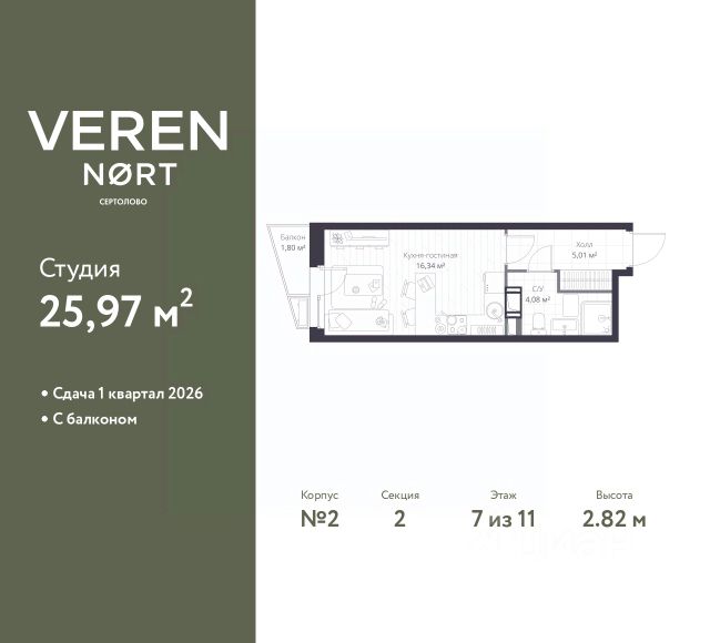 Продается просторная студия от застройщика в жилом комплексе "Бионика Заповедная" в динамичном Приморском районе. До метро можно добраться на транспорте всего за 11 минут. Удобная, классическая, функциональная европланировка, просторная прихожая 4.45 м². Общая площадь студии - 25.75 м², жилая 18 м², высота потолка 2.77 м. Квартира продается с отделкой "Норд Лайн светлый плюс". Что особенного в ЖК "Бионика Заповедная"? • Оазис в городе 3 минуты пешком до Новоорловского заказника (140 ГА) • Захватывающие виды из окон на хвойный лесопарк • Всесезонный "Заповедный парк" во дворе площадью 23000 кв.м. • 5 единых входных групп с авторским дизайном и лаундж-зонами, сити-виллы на первых этажах с палисадниками и высотой потолков до 4 м • Места притяжения: фонтан "Бионика", спортивный кластер со скейт-парком, фотозоны с арт-объектами